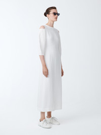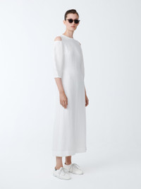 A full-length dress with an oversized fit for relaxed, effortless wear, the Barr Dress is made in a fully lined twill weave that resembles linen but has a more fluid drape. Skimming the body with gentle shaping at the waist and bust, it features cut-out shoulders and curved, three-quarter-length sleeves with keyhole openings at the cuff, mother-of-pearl buttons, and elastic loop closures. DETAILS - Fully lined - Centre-front seam and centre-back invisible zipLouise is 5'11"/ 177.8 cms and wears a UK8 CARE Main Fabric: 100% Triacetate Lining: 100% Viscose Dry Clean Only Made in Portugal