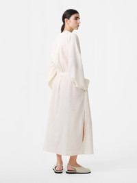 Studio Nicholson’s ‘fabric first’ philosophy is exemplified by this Blanca dress. The dress is cut from minimal matelasse that falls softly over the body and noted for its textured hand feel. Sister to the Seil top, Blanca is constructed with a stand collar, raglan sleeves and long side splits, further accentuating the relaxed, fluid silhouette. DETAILS - Stand collar - Front keyhole opening - Raglan sleeves - Mid-calf lengthRebecca is 5’10” / 177.5 cms and wears a size UK8 CARE 74% Cotton 26% Polyamide Do NOT Iron | Dry Clean Made in Portugal