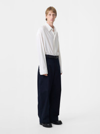 Lightweight and versatile, the mid-rise Bosworth pant comes in an adaptable Darkest Navy shade that feels fitting for the new season. They’re cut to a gently voluminous leg from a cotton blend that’s tightly woven to a soft technical twill — the sort you’d associate with a classic trench. DETAILS - Mid-rise flat front - Belt loops - Zip fly with button closure - Slanted side pockets and two rear buttoned welt pockets - Internal jigger button - Wear it with the matching Ruskin ShirtJosefp is 6'2" / 187 cms and wears a Medium CARE 68% Cotton 32% Polyamide Cordura Delicate Dry Clean Only Made in Portugal