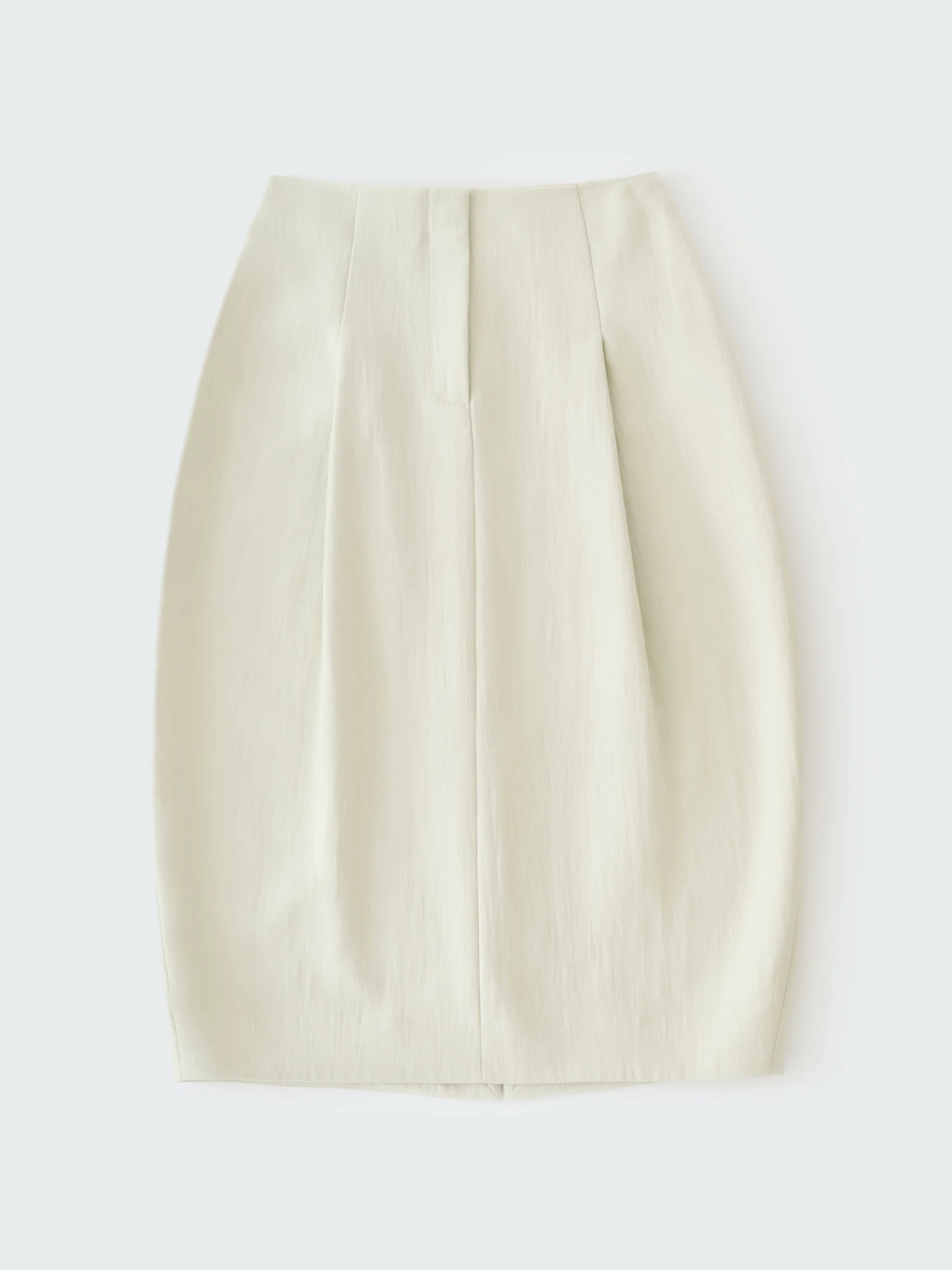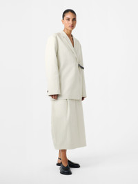 The Carson skirt is cut from a textured double cotton that’s woven to a twill weave, creating a soft structure that helps lend a sculptural bell-like shape to the silhouette. It has deep inverted pleats that are cleverly folded to create extra volume and which also draw the eye down to a thick folded midi hem that stops at the calf. DETAILS - Concealed hook and zip fastening - Reverse welt pocket - Single back vent - Wear it with the matching Silas JacketMiko is 5'9" / 177cms and wears a size UK8 CARE 95% Cotton 5% Polyamide Hand Wash | Cool Iron Made in Portugal