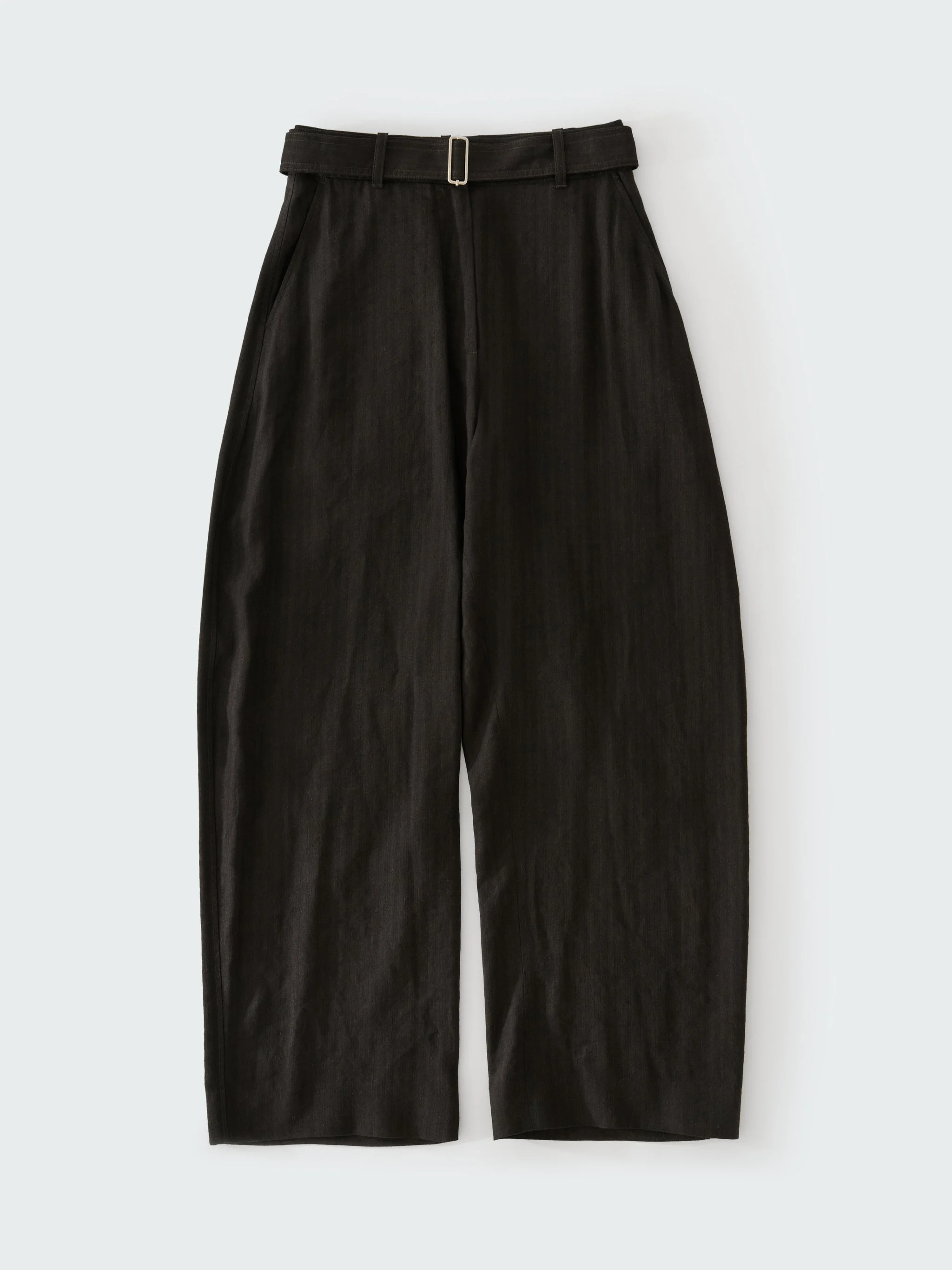Studio Nicholson’s modern take on traditional tailoring continues with the Chatto pants. A move on from our staple Doring silhouette, these women’s brown trousers are cut from broken herringbone: a yarn-dyed blend of viscose and linen that balances natural texture with a soft drape – and shaped with a belted mid waist that be used to amplify the voluminous curve in the leg. DETAILS - Belted waist - Slant pockets - Curved leg - Rear buttoned jet pockets - Wear it with the matching Krauss ShirtQing is 5'10''/ 177 cms and wears a size UK8 CARE Main Fabric: 52% Viscose 48% Linen Lining: 100% Cotton Delicate Dry Clean Only Made in Portugal