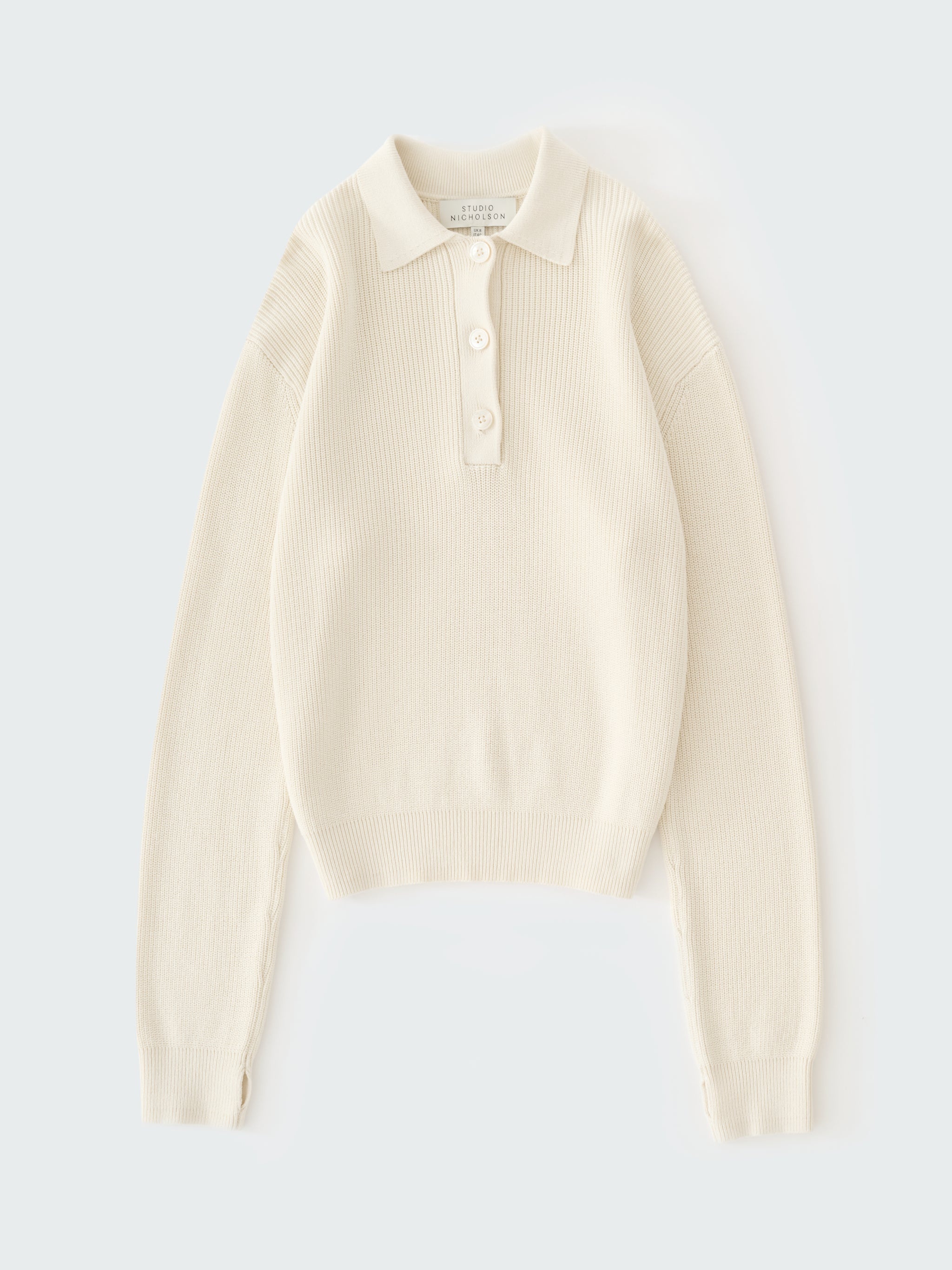 Following a classic polo-shirt silhouette, the Chesapeake is made from dry cotton that’s constructed in a 7-gauge ribbed knit – imbuing it with a bouncy tactility. This long-sleeved style is finished with a neat contrast collar and a buttoned placket. DETAILS - Polo collar - Buttoned placketMiko is 5'9" / 177cms and wears a size UK8 CARE 100% Cotton Hand Wash | Cool Iron On Reverse