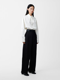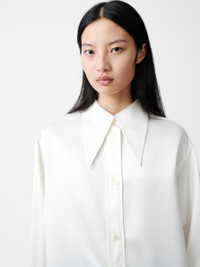 The highest quality fabrics with tactile and performance in mind are always at the forefront for SN, echoed in the glossy wool-viscose satin of the Gable shirt. It’s loosely cut with elevated design details like an exaggerated point collar, nonchalant dropped shoulders and milky mother-of-pearl buttons that are dotted down to the hem. DETAILS - Flat felled seams - Wide, long sleeves - Mother-of-pearl button closure - Cut from a lustrous viscose wool satin mixChen is 5'10"/ 178 cms and wears a UK8 CARE 77% Viscose 23% virgin Wool Dry Clean Only Made in Portugal