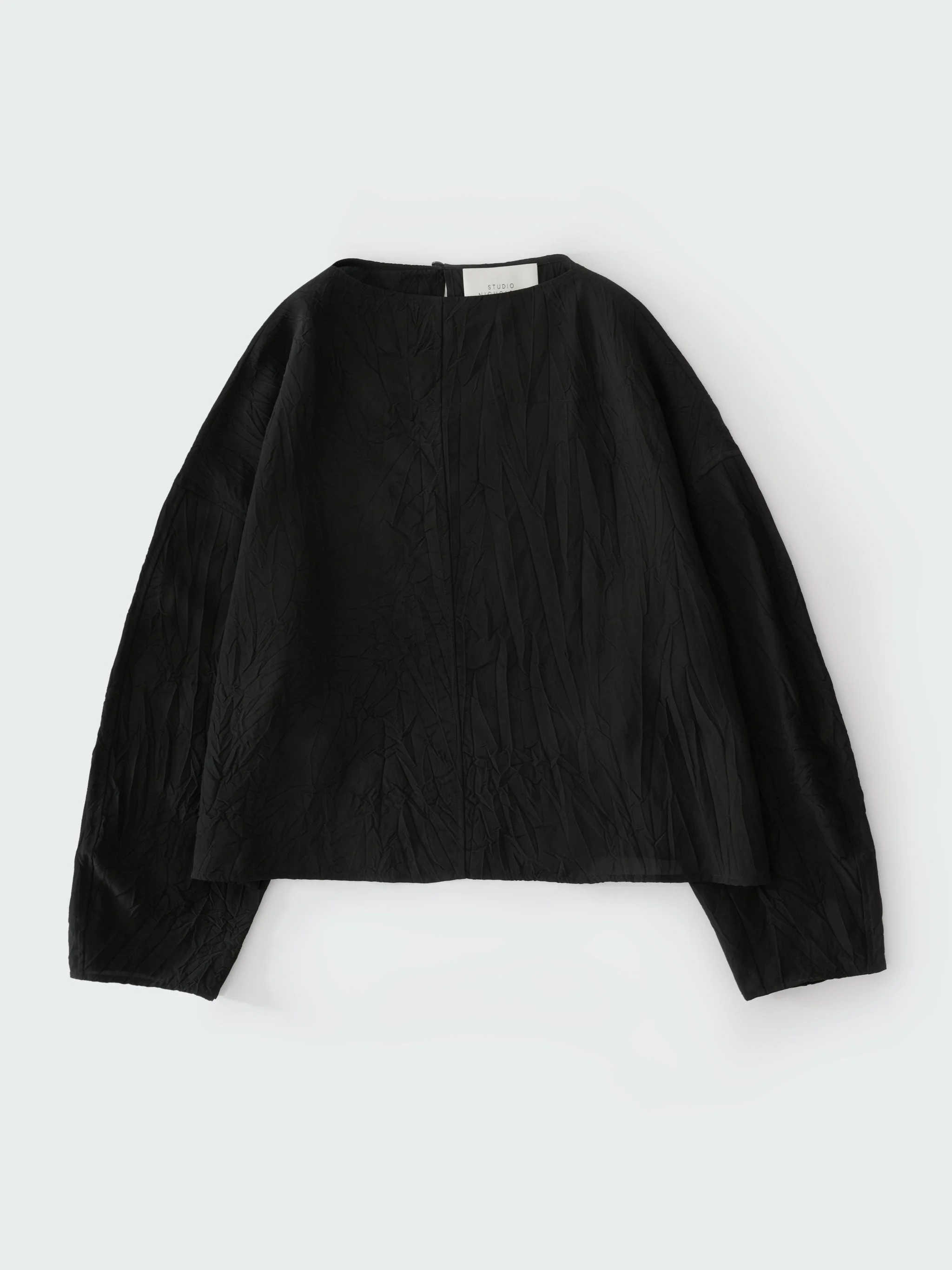Lau is a contemporary twist on the humble black long-sleeved top. It’s cut from our crushed viscose fabric: an Italian-milled material with a creased, irregular finish that drapes effortlessly and chosen here to amplify the boxy silhouette. DETAILS - Nape button - Long sleeves - Boxy fit - Wear it with the matching Oates Skirt - PLEASE NOTE - WITH WEAR THE CREASES IN THIS FABRIC WILL REDUCE AND THIS SHOULD BE SEEN AS A CHARACTERISTIC OF THIS MATERIAL.Qing is 5'10''/ 177 cms and wears a size UK8 CARE 100% Viscose Dry Clean Only Made in Portugal