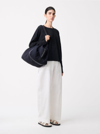 Oversized long sleeve t-shirt made from a mercerized cotton jersey. Details: - Boxy fit - Crew neck - Dropped shoulder - Screen printed branding on the nape Emmanuelle is 5’10” / 178cm, she wears a size 0Runs large, for a less oversized fit take a size down from your usual size DETAILS & CARE 100% Cotton Made in Portugal Delicate Wash at 30°C