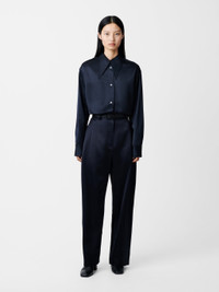 The Myers provide a longer version of our signature Chalco Pant. With a loose fit and a curved leg, they have a felled hem for easy tailoring. They are made in a wool-viscose satin with a lightweight hand feel and smooth texture with a lustrous shine. Designed to be worn at the mid-waist or higher, they feature Italian pockets and a flap pocket at the back. DETAILS - Hook and bar closure at the waist - Wear it with the matching Gable ShirtChen is 5'10"/ 178 cms and wears a UK8 CARE 77% Viscose 23% Virgin Wool Dry Clean Only Made in Portugal