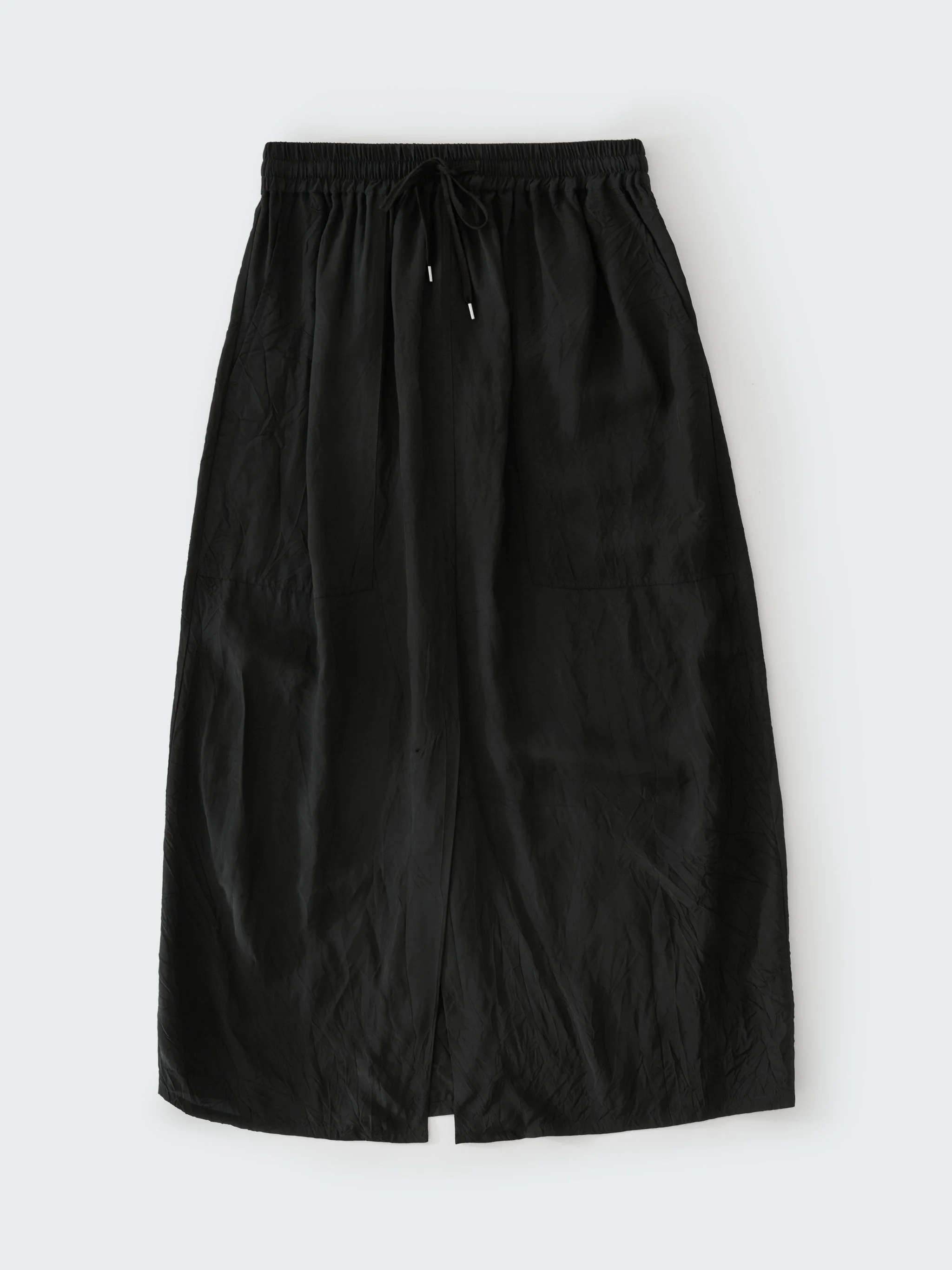 An update on a pared-back black maxi skirt, Oates is cut from our crushed viscose: an Italian-milled material with a creased, irregular finish that drapes effortlessly and chosen here to amplify the fluid, A-line frame. Constructed with an elasticated waistband with drawstrings and a front vent, this easy-to-wear skirt is fitted with generous Italian patch pockets that recall our longstanding workwear influences. DETAILS - Elasticated waist - Italian pockets - Front vent - Fixed side cord - Wear it with the matching Lau Top- PLEASE NOTE - WITH WEAR THE CREASES IN THIS FABRIC WILL REDUCE AND THIS SHOULD BE SEEN AS A CHARACTERISTIC OF THIS MATERIAL.Qing is 5'10''/ 177 cms and wears a size UK8 CARE 100% Viscose Dry Clean Only Made in Portugal