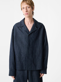 A camp collar overshirt cut from our indigo slub cotton: an Italian-milled cotton and linen blend woven from indigo-dyed yarns. Designed with a cropped and boxy fit, it features a concealed placket and a straight workwear-inspired hem. DETAILS - Boxy fit - Cropped length - Concealed placket - Convertible collar: can be fastened up to the neck by a concealed button - Wear it with the matching Elio Short or Levy PantJosefp is 6'2" / 187 cms and wears a Medium CARE 50% Cotton 50% Linen Delicate Wash at 30°C | Cool Iron Made in Portugal