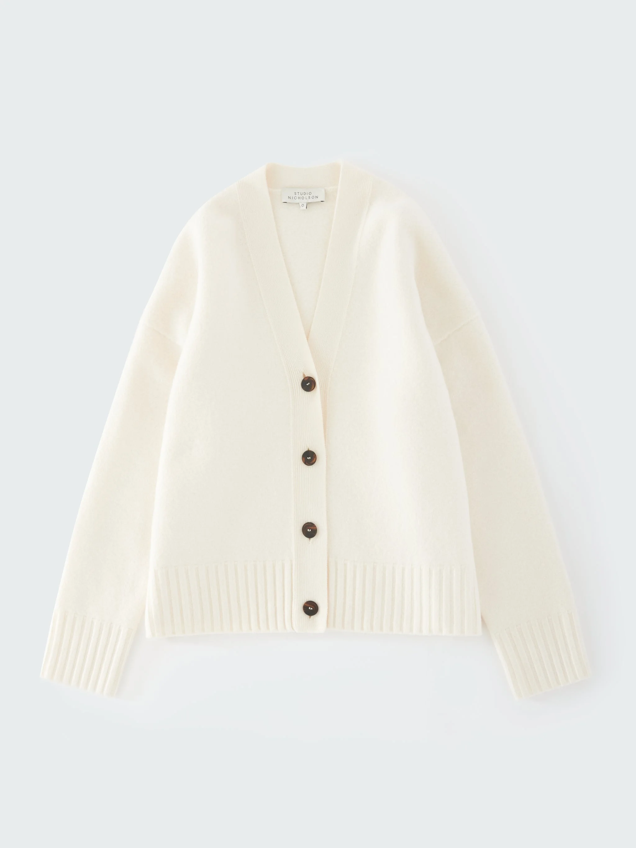The Sake cardigan has a short, boxy shape, accentuated by its gently elongated sleeves. It’s knitted from a smooth merino wool that’s been gently boiled to create a rich fleecy texture. DETAILS - Button front - Dropped shoulder - Softly boiled merino wool - Short, wide shape Chen is 5'10"/ 178 cms and wears a UK8Runs large, for a less oversized fit take a size down from your usual size CARE 100% Merino Wool Dry Clean Only