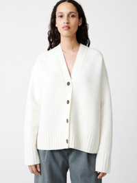 The Sake cardigan has a short, boxy shape, accentuated by its gently elongated sleeves. It’s knitted from a smooth merino wool that’s been gently boiled to create a rich fleecy texture. DETAILS - Button front - Dropped shoulder - Softly boiled merino wool - Short, wide shape Chen is 5'10"/ 178 cms and wears a UK8Runs large, for a less oversized fit take a size down from your usual size CARE 100% Merino Wool Dry Clean Only