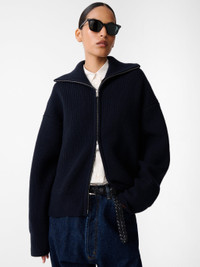 Furnished with a warming high neck and a two-way zip front, the Sandos knit is rendered from RWS-standard extrafine merino wool in a bouncy 5-gauge rib for softness. It’s cut to a boxy, blouson-inspired fit that’s quite cropped on the torso and then finished with thumbhole cuffs. DETAILS - Boxy fit - High neck - Dropped shoulders - Two-way zipped front - Ribbed trimsTheodor is 6'2" / 188 cms and wears a MediumLuana is 5'10" / 178 cms and wears a Small CARE 100% RWS Extrafine Merino Wool Hand Wash & Dry Flat | Dry Clean