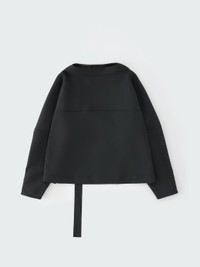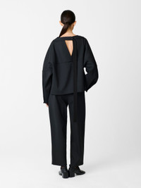 Made from a compact poly viscose blend, the Velho top has a textured matte finish that adds a sense of depth to the black colourway. Flat-felled seams run along the collar, chest and back for added structure and a V-shaped buttoned fastening to the reverse allows the silhouette to hang with a clean drape. DETAILS - Wide boat neck - V-shaped back opening - Loose, flowing sleeves - Robust poly-viscose blendRebecca is 5’10” / 177.5cm, she wears a size UK8 CARE 64% Polyester 34% Viscose 2% Elastane Delicate Dry Clean | Cool Iron Made in Portugal