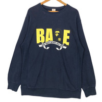 Vintage Bape Crewneck Sweatshirt in navy blue colour. Pullover sweater with printed graphic on the front. Still in good condition EXCEPT small sun bleach and pinhole on the sweater. See pictures for more details Condition : 7.9/10 Measurement Pit : 23.5 inch Length : 31.5 inch Shoulder : 21.5 inch Sleeve : 27 inch Size On Tag : L Size Recommended : L Normal Shipping FEDEX Processing time : 7-14 days Express Shipping DHL Processing time : 4-7 days IMPORTANT Check the manual measurement given before purchase. Failed to do so, no refund. StuffM194