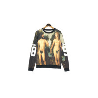 Bershka Adam And Eve crewneck sweatshirt in black colour. Full print sweater. Still in good condition EXCEPT some hairballs. See pictures for more details Condition : 7.9/10 Measurement Pit : 19.5 inch Length : 25 inch Shoulder : 17 inch Sleeve : 26 inch Size On Tag : S Size Recommended : S Normal Shipping FEDEX Processing time : 7-14 days Express Shipping DHL Processing time : 4-7 days IMPORTANT Check the manual measurement given before purchase. Failed to do so, no refund. StuffM172