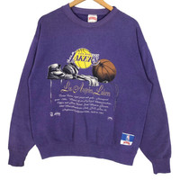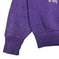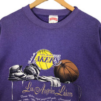 Vintage 90s Los Angeles Lakers crewneck sweatshirt by Nutmeg Mills in purple colour. Pullover sweatshirt with embroidered logo on the front. Still in good condition EXCEPT very tiny little hole at the babc of the wrist. See pictures for more details Condition : 9/10 Measurement Pit : 23 inch Length : 25 inch Shoulder : 23 inch Sleeve : 24 inch Size On Tag : M Size Recommended : M-L Normal Shipping FEDEX Processing time : 7-14 days Express Shipping DHL Processing time : 4-7 days IMPORTANT Check the manual measurement given before purchase. Failed to do so, no refund. StuffM165