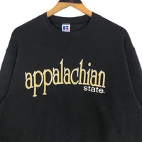 Vintage 90s Appalachian State University The Mountaineers crewneck sweatshirt by Russell Athletic in black colour. Pullover sweater with printed logo on the front. Still in good condition. See pictures for more details Condition : 9/10 Measurement Pit : 22 inch Length : 25 inch Shoulder : 21 inch Sleeve : 24 inch Size On Tag : Size Recommended : M Normal Shipping FEDEX Processing time : 7-14 days Express Shipping DHL Processing time : 4-7 days IMPORTANT Check the manual measurement given before purchase. Failed to do so, no refund. StuffM177