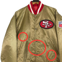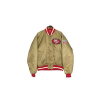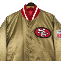Vintage 90s NFL San Francisco 49ERS varsity jacket in brownish gold colour. Button up nylon jacket with embroidered logo on both side. Still in good condition EXCEPT slightly defect on the wrists (no white stripe) and few washable dirts on the jacket. See pictures for more details Condition : 6.9/10 Measurement Pit : 26.5 inch Length : 26.5 inch Shoulder : 21 inch Sleeve : 27 inch Size On Tag : L Size Recommended : L-XL Normal Shipping FEDEX Processing time : 7-14 days Express Shipping DHL Processing time : 4-7 days IMPORTANT Check the manual measurement given before purchase. Failed to do so, no refund. StuffM189