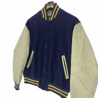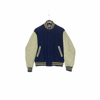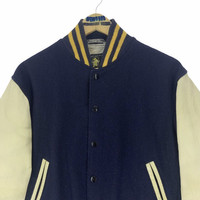 Vintage 90s Golden Bear leather varsity jacket in navy blue colour. Button up wool jacket. Good condition EXCEPT some washable dirts on the lining and on both sleeve. See the pictures for more details Condition : 8/10 Measurement Pit : 23.5 inch Length : 23.5 inch Shoulder : 19 inch Sleeve : 24.5 inch Size On Tag : L Size Recommended : L Shipping DHL Processing time : 3-5 days IMPORTANT Check the manual measurement given before purchase. Failed to do so, no refund. StuffM69