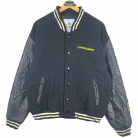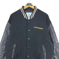 Vintage 90s International Lifeguard USA varsity jacket in black colour. Button up wool varsity jacket with leather sleeve and embroidered logo on both side. Good condition EXCEPT very small tear/hole on the lining. See the pictures for more details Condition : 8.8/10 Measurement Pit : 23.5 inch Length : 25.5 inch Shoulder : 22 inch Sleeve : 24 inch Size On Tag : M Size Recommended : M-L Shipping DHL Processing time : 3-5 days IMPORTANT Check the manual measurement given before purchase. Failed to do so, no refund. StuffM81