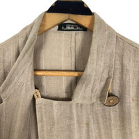 Vintage 90s Issey Miyake Permanente hemp jacket in beige colour. Asymmetrical button up light jacket. Still in good condition EXCEPT some stains and washable dirts on both side. See pictures for more details Condition : 6.9/10 Measurement Pit : 23 inch Length : 31.5 inch Shoulder : 19 inch Sleeve : 22 inch Size On Tag : M Size Recommended : M-L Normal Shipping FEDEX Processing time : 7-14 days Express Shipping DHL Processing time : 4-7 days IMPORTANT Check the manual measurement given before purchase. Failed to do so, no refund. StuffM156