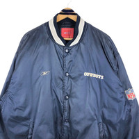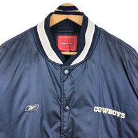 Vintage 90s NFL Dallas Cowboys X Reebok bomber jacket in navy blue colour. Button up quilted lining bomber jacket with embroidered logo on both side. Good condition EXCEPT slightly stains on the shoulder. See pictures for more details Condition : 8/10 Measurement Pit : 28 inch Length : 30 inch Shoulder : 25 inch Sleeve : 25.5 inch Size On Tag : XL Size Recommended : XL-XXL Shipping DHL Processing time : 3-5 days IMPORTANT Check the manual measurement given before purchase. Failed to do so, no refund. StuffM102