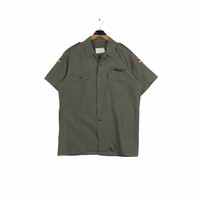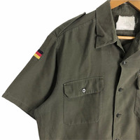 Vintage 90s L. Wahler German Military button up shirt in olive green colour. Embroidered name tag on the left pocket and printed logo at the back with German emblem sewn on both sleeve. Good condition EXCEPT tag is little bit faded. See the pictures for more details Condition : 8.5/10 Measurement Pit : 24 inch Length : 30 inch Shoulder : 18 inch Sleeve : 9 inch Size On Tag : L Size Recommended : M-L Shipping DHL Processing time : 3-5 days IMPORTANT Check the manual measurement given before purchase. Failed to do so, no refund. StuffM85