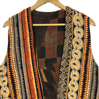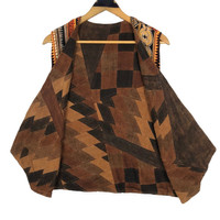 Vintage patchwork cutaway vest in brown colour. Buttonless sleeveless vest in navajo pattern. Still in good condition. See pictures for more details Condition : 9/10 Measurement Pit : 19 inch Length : 23.5 inch Shoulder : 15 inch Sleeve : - Size On Tag : none Size Recommended : S Normal Shipping FEDEX Processing time : 7-14 days Express Shipping DHL Processing time : 4-7 days IMPORTANT Check the manual measurement given before purchase. Failed to do so, no refund. StuffM173
