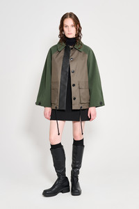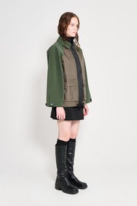 Bandhagen Patch is a varsity-style rain jacket for women. This two-tone, two-texture design has taped inside seams, making it resistant to wind and rain. The body of the garment is made up of a breathable nylon fabric, while the sleeves and collar are made in our classic sturdy and hard-wearing waterproof fabric with a matte finish. The tapered sleeves and relaxed fit add an elegant yet casual look to the style – making it the most stylish raincoat imaginable. The model is 176 cm / 5′ 8″ Wearing → SIZE S GARMENT DETAILS Heavyweight 530-gram fabric (sleeves and collar) Breathable woven nylon fabric (body) Wind and water-resistant Relaxed fit Hip-length Raglan sleeve construction Hidden button front fastening Patch pockets Debossed logo at back of collar Taped inside seams Designed in Stockholm Made in Europe MATERIAL Sleeves & collar: Coating: 100% PVC rubberized coating Membrane: 52% cotton, 48% polyester Body: 100% polyester Read more about our fabrics