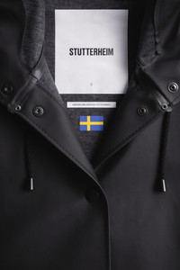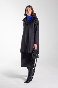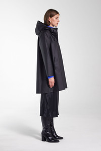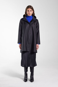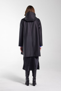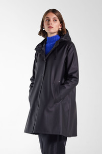 Mosebacke, a hilltop overlooking Stockholm and your top wardrobe staple, is an artisanally made a-line-shaped raincoat for women. The sturdy and hard-wearing waterproof fabric is tailored with double-welded seams, making it impossible for any moisture to seep through. Ease of movement and comfort is achieved with under-arm eyelets and a drawstring hood. The model is 179 cm / 5′ 10″ Wearing → SIZE S GARMENT DETAILS • Heavy-weight 530-gram fabric • Completely waterproof • A-line silhouette • Snap metal button closures • Drawstring hood • Open welt pockets • Double welded seams • Under-arm eyelets for ventilation • +20 000 mm water column pressure • Designed in Stockholm • Made in Europe MATERIAL Coating: 100% PVC rubberized coating Membrane: 52% cotton, 48% polyester Read more about our fabrics