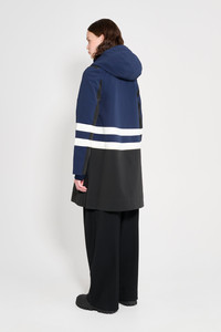 Blackeberg is an artisanally made a-line-shaped raincoat for women. The waterproof fabric has a matte-textured finish and is tailored with triple-welded seams, making it impossible for any moisture to seep through. Ease of movement and comfort are achieved with under-arm eyelets and a drawstring hood, while the two-tone design and colour-block stripes make this a true statement style, defying bad weather in the name of fashion. The model is 176 cm / 5′ 8″ Wearing → SIZE S GARMENT DETAILS - Heavyweight 530-gram fabric - Matte-textured finish - Completely waterproof - A-line silhouette - Snap metal button front closure - Drawstring hood - Webbed laces - Patch pockets with flaps - Triple-welded seams - Under-arm eyelets for ventilation - +20 000 mm water column pressure - Designed in Stockholm - Made in Europe MATERIAL Coating: 100% PVC rubberized coating Membrane: 52% cotton, 48% polyester Read more about our fabrics