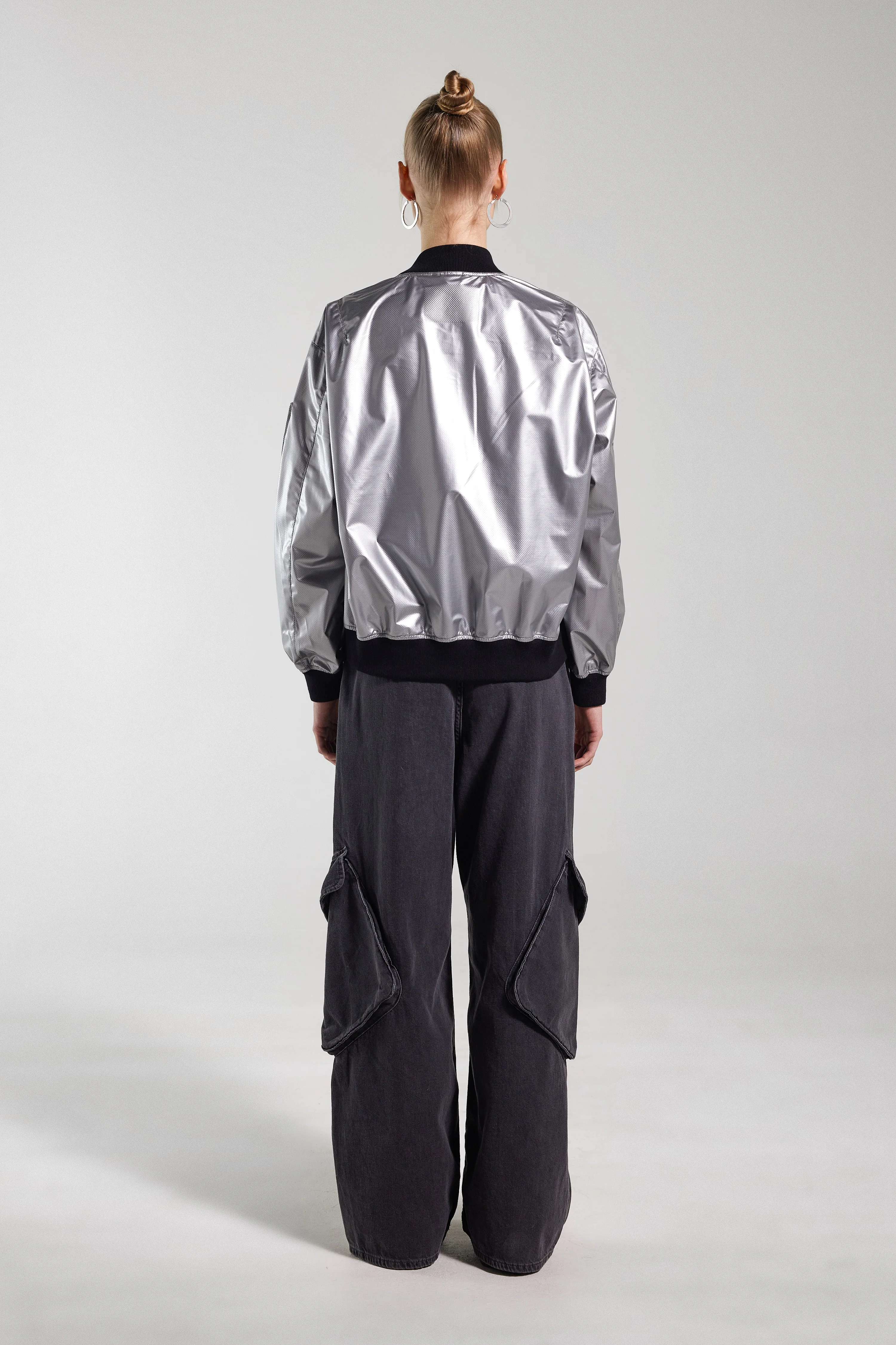 Bredsand Silver is a unisex bomber jacket crafted from a light-reflecting thermo fabric, providing warmth while being light and breathable. The waterproof zipper ensures protection from the elements. Practicality is enhanced with pocket lids and interior zip pockets, while ribbed cuffs, collar, and hem offer a sleek, comfortable fit for everyday wear. The model is 175 cm / 5′ 9” Wearing → SIZE S GARMENT DETAILS • Silver thermo exterior fabric • Nylon mesh lining • Wind and water-resistant • Unisex style • Aquaguard zipper • Slanted side pockets with lids • Two interior pockets with zip • Sleeve-pocket • Ribbed cuff, collar and bottom hem • Velcro patch on lapel • Designed in Stockholm • Made in Europe MATERIAL Coating: 100% polyester Membrane: 100% polyurethane Read more about our fabrics