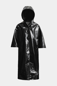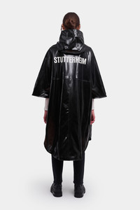 Concert Print Opal is a poncho-style raincoat in light yet sturdy waterproof fabric with a shiny finish, featuring a bold STUTTERHEIM logo print across the back. One size fits all, this open and flowy design has a snap metal button closure which gathers the sides into three-quarter length sleeves, making this piece perfect for layering and moveability. The double-welded seams ensure that no moisture seeps through while the generously sized drawstring hood shields from wind and rain. GARMENT DETAILS - Mid-weight 280-gram fabric - Shiny high-gloss fabric finish - Completely waterproof - Onesize - Knee-length rain poncho - Printed STUTTERHEIM logo on back - Snap metal button closure under sleeves and on front - 3/4 sleeve length - Double welded seams - Drawstring hood - Open front pockets - +20 000 mm water column pressure - Designed in Stockholm - Made in Europe MATERIAL Coating: 100% PVC rubberized coating Membrane: 52% cotton, 48% polyester Read more about our fabrics