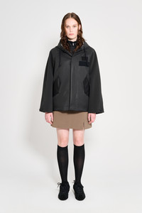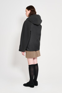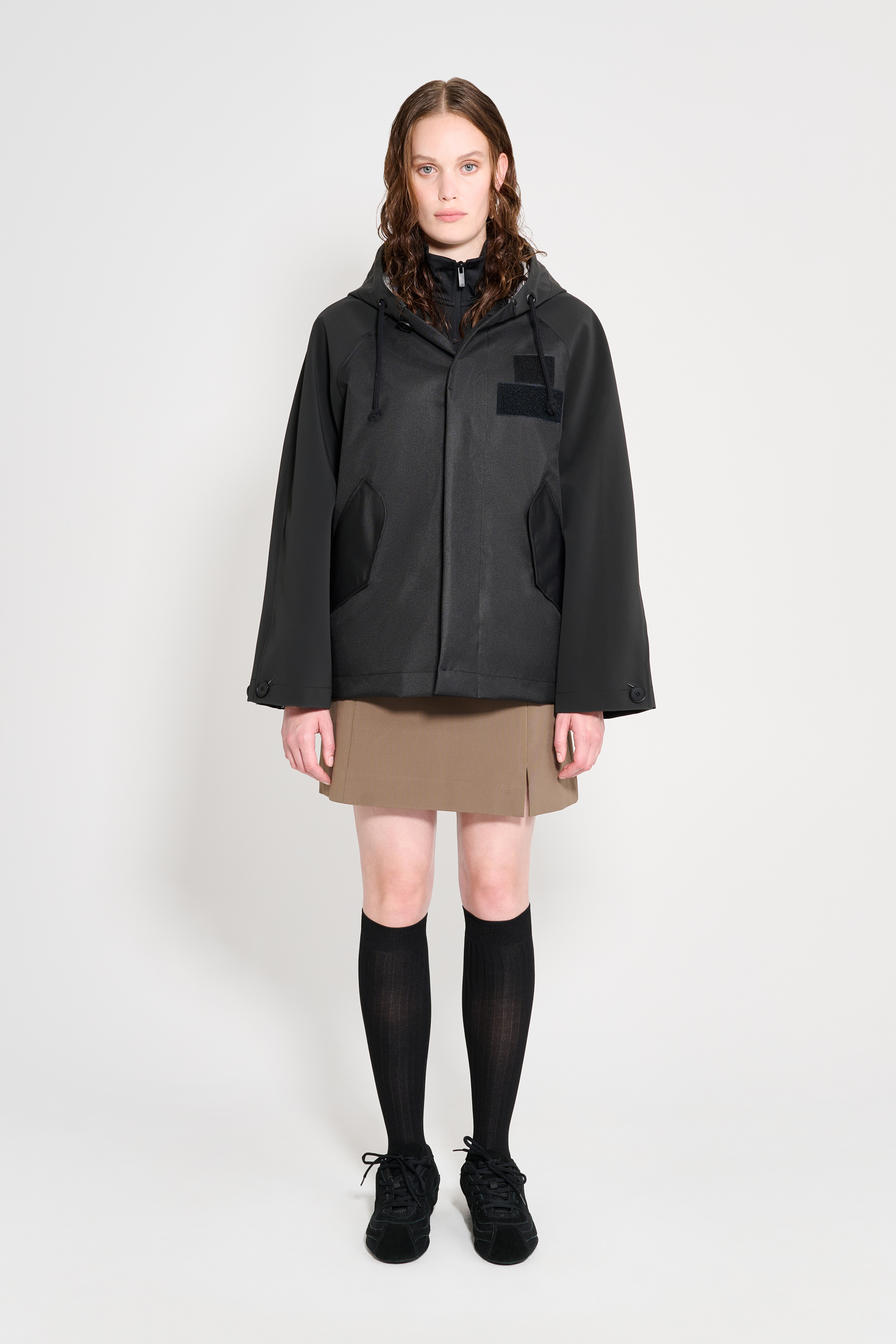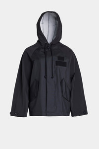 Hjorthagen is a short, hooded rain jacket for women. This two-tone, two-texture design has taped inside seams, making it resistant to wind and rain. The body of the garment is made up of a breathable nylon fabric, while the sleeves and hood are made in our classic sturdy and hard-wearing waterproof fabric with a matte finish. The tapered sleeves and relaxed fit add an elegant yet casual look to the style – making it the most stylish raincoat imaginable while not compromising on function. The model is 176 cm / 5′ 8″ Wearing → SIZE M GARMENT DETAILS • Heavyweight 530-gram fabric (sleeves and collar) • Breathable woven nylon fabric (body) • Wind and water-resistant • Taped inside seams • Relaxed fit • Hip-length • Drawstring hood with chunky cotton strings • Raglan sleeve construction • Hidden button front fastening • Slanted side pockets with flaps and snap button closure • Velcro patch on the chest • Designed in Stockholm • Made in Europe MATERIAL Sleeves & collar: Coating: 100% PVC rubberized coating Membrane 52% cotton, 48% polyester Read more about our fabrics