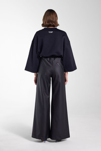 Jarla are coverall trousers for women in light and airy waterproof fabric. Constructed with double-welded seams for complete rain protection, these trousers are perfect for staying stylish in wet weather. The high drawstring waist and wide leg add femininity and ease of movement as well as making the trousers quick and easy to transition in and out of. The front patch pocket on each leg and slated single back pocket with an aqua guard zipper add practicality as well as a stylish touch. The model is 177 cm / 5′ 10″ Wearing → SIZE S GARMENT DETAILS - Lightweight 230-gram fabric - Completely waterproof - High-waist with elasticated hem - Wide leg - Double-welded seams - Front patch pocket on each leg - Open side pocketsSlanted single back pocket with aqua guard zipper - +20 000 mm water column pressure - Designed in Stockholm - Made in Europe MATERIAL Coating: 100% PVC rubberized coating Membrane: 100% polyester Read more about our fabrics