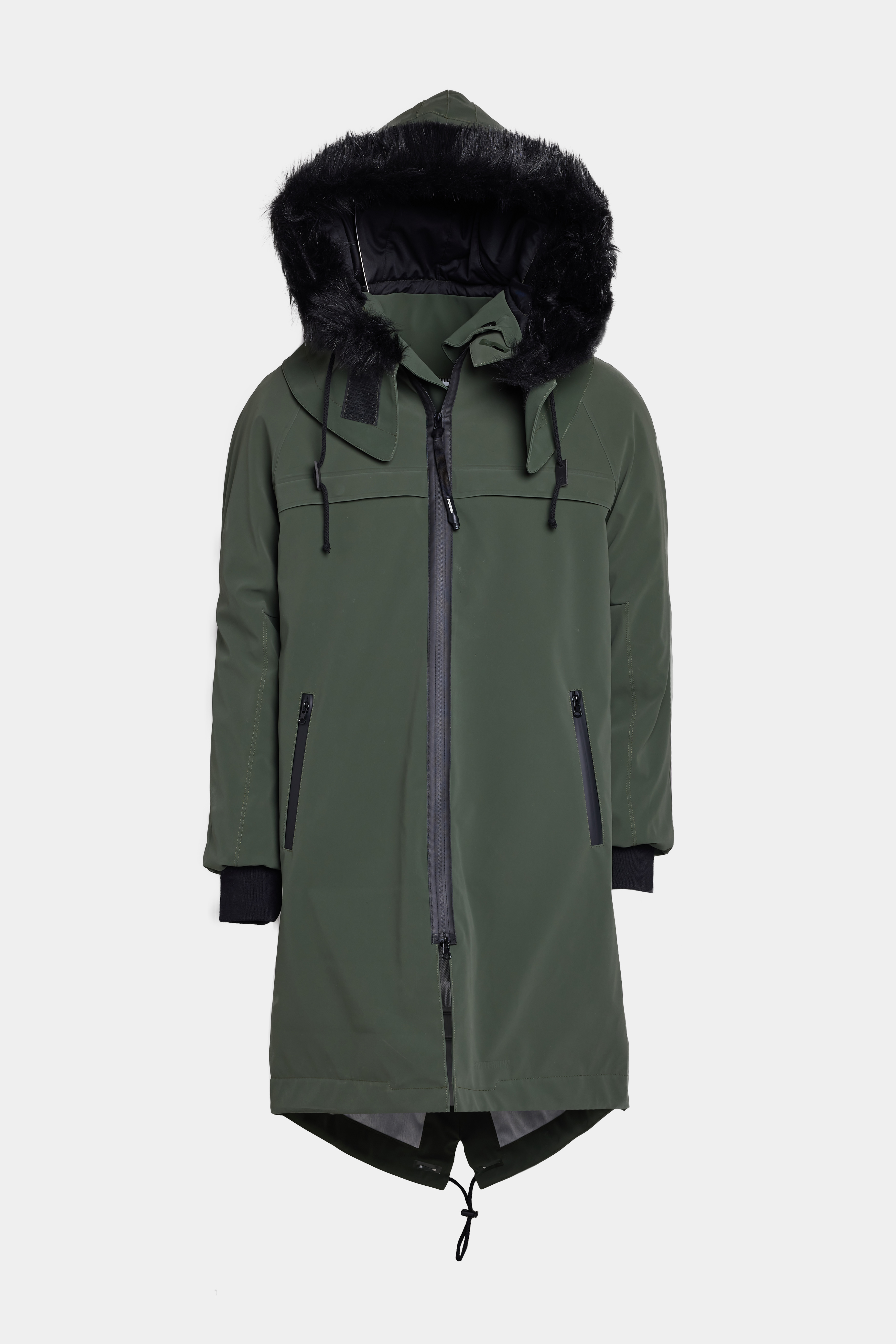 Kalix is a straight-fitting fishtail parka in sturdy and hard-wearing waterproof fabric. It’s insulated with padding for warmth during the winter season. Expertly made, this warm rain jacket is tailored with double-welded seams for complete protection against wet and cold weather. The detachable and adjustable collar and hood with a faux fur brim add extra comfort and warmth to the style. GARMENT DETAILS • Midweight 280-gram shell fabric • Matte-textured finish • Completely waterproof • 150-gram technical insulator filling • Polyester lining • Straight unisex fit • Knee-length • Adjustable drawstring fishtail back detail • Aqua guard zipper • Detachable hood with faux fur brim • Adjustable toggles and overlapping velcro front closure on hood • Knitted wristlets • Fleece-lined side pockets • Fleece-lined inner pocket • Double-welded seams • +20 000 mm water column pressure • Designed in Stockholm • Made in Europe MATERIAL Coating: 100% PVC rubberized coating Membrane: 100% polyester Lining: 100% polyester with poly filling Faux fur: 100% polyester Read more about our fabrics