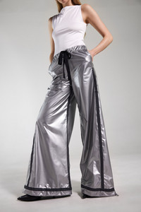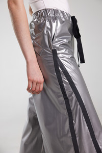 Karla Tape Silver are trousers for women in an airy and light-reflecting thermo fabric. These high-waist trousers have taped inside seams, making them resistant to wind and rain. The wide legs are decorated with reflective taped seams that add both glow-in-the-dark functionality and a style statement. GARMENT DETAILS - Silver thermo fabric - Wind and water-resistant - High-waist with elasticated hem - Flared legs - Decorative reflective tape-detailing - Taped inside seams - Open side pockets - Slanted zipped back pocket - Designed in Stockholm - Made in Europe MATERIAL Coating: 100% polyester Membrane: 100% polyurethane Read more about our fabrics