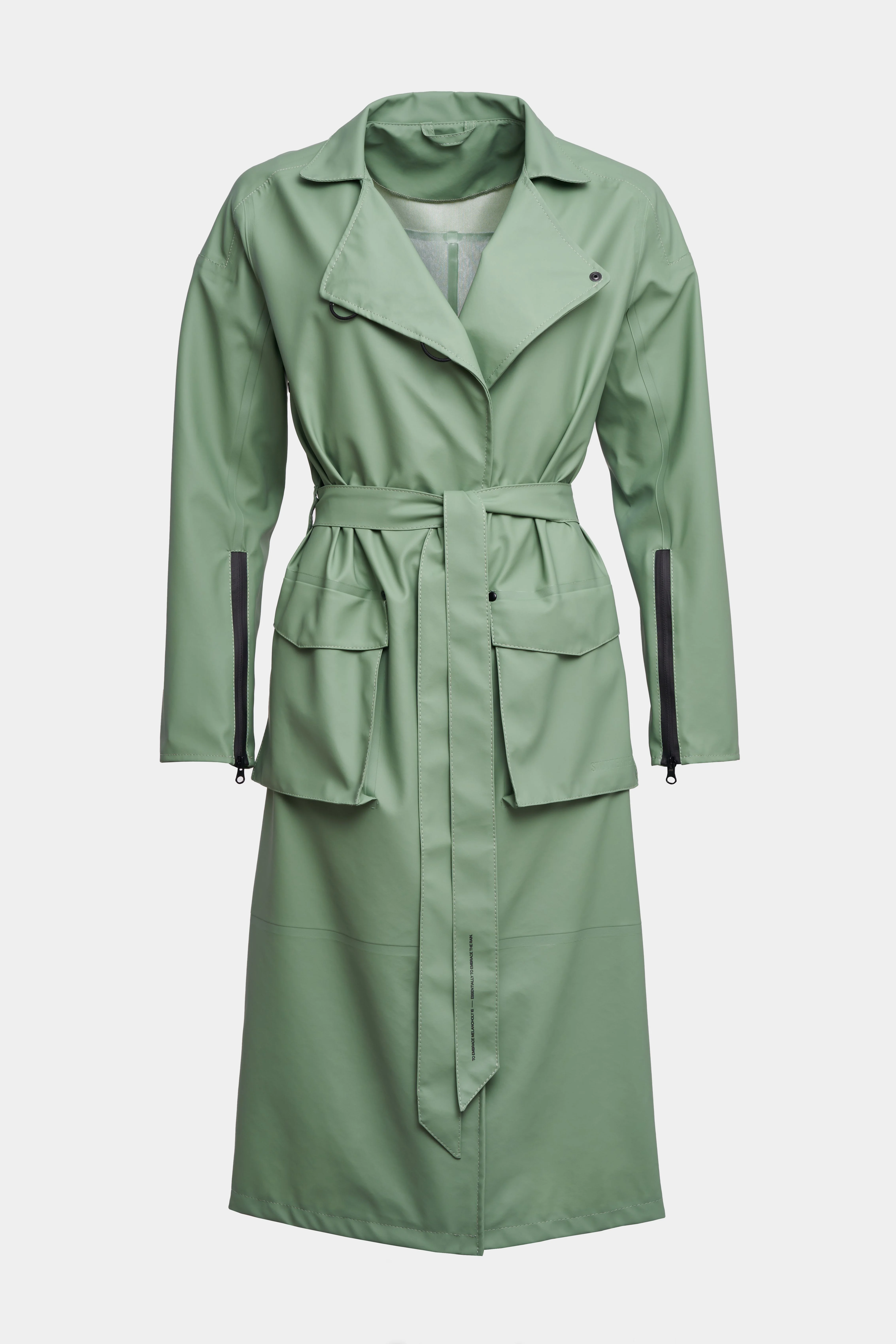 Kista is a belted trench coat for women in light and airy waterproof fabric. The knee-length tailored fit is constructed with double-welded seams for complete protection against the rain. The classic silhouette is complemented by modern design details such as sleeve zippers and side slits at the bottom hem, which adds comfort and ease of movement. This style combines elegance and utility – making it the perfect piece for formal occasions on bad weather days. The model is 178 cm / 5′ 10″ Wearing → SIZE S GARMENT DETAILS • Mid-weight 280-gram fabric • Completely waterproof • Belted trench coat • Tie waist belt • Knee-length • Side slits at bottom hem • Snap metal button closures • Sleeve zippers • Flap front pockets • Double welded seams • Under-arm eyelets for ventilation • +20 000 mm water column pressure • Designed in Stockholm • Made in Europe MATERIAL Coating: 100% PVC rubberized coating Membrane: 100% polyester Read more about our fabrics