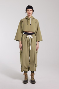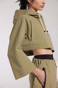 Lilla Tre is a super cropped hooded raincoat for women in sturdy waterproof fabric that is crafted with double-welded seams, making it impossible for any moisture to seep through. This short and stylish piece is perfect for layering and to pair with one of our high-waisted rain trousers for a completely waterproof yet fashionable look. The model is 176 cm / 5′ 8″ Wearing → SIZE S GARMENT DETAILS - Heavyweight 530-gram fabric - Completely waterproof - Wide bell sleeves - Seamless shoulder construction - Cropped body length - Drawstring hood with chunky cotton laces - Hidden press buttons - Open side pockets - Under-arm eyelets for ventilation - +20 000 mm water column pressure - Designed in Stockholm - Made in Europe MATERIAL Coating: 100% PVC rubberized coating Membrane: 52% Cotton, 48% polyester Read more about our fabrics
