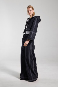 Lilla Tre Tape is a super cropped hooded rain jacket for women in light and breathable water-resistant fabric. This short and stylish piece is perfect for layering and to pair with one of our high-waisted rain trousers for a waterproof and fashionable look. The decorative reflective taped seams add both functionality and style. The model is 175 cm / 5′ 9” Wearing → SIZE S GARMENT DETAILS - Lightweight nylon fabric - Water-resistant - Breathable - Cropped body length - Wide bell sleeves - Decorative reflective tape-detailing - Drawstring hood with chunky cotton laces - Chunky laced drawstring at waist hem - Aquaguard front zip - Two front patch pockets - Extra large under-arm eyelets for ventilation - Seamless shoulder construction - +20 000 mm water column pressure (?) - Designed in Stockholm - Made in Europe MATERIAL Coating: 100% polyester Membrane: 100% thermoplastic elastomer Read more about our fabrics
