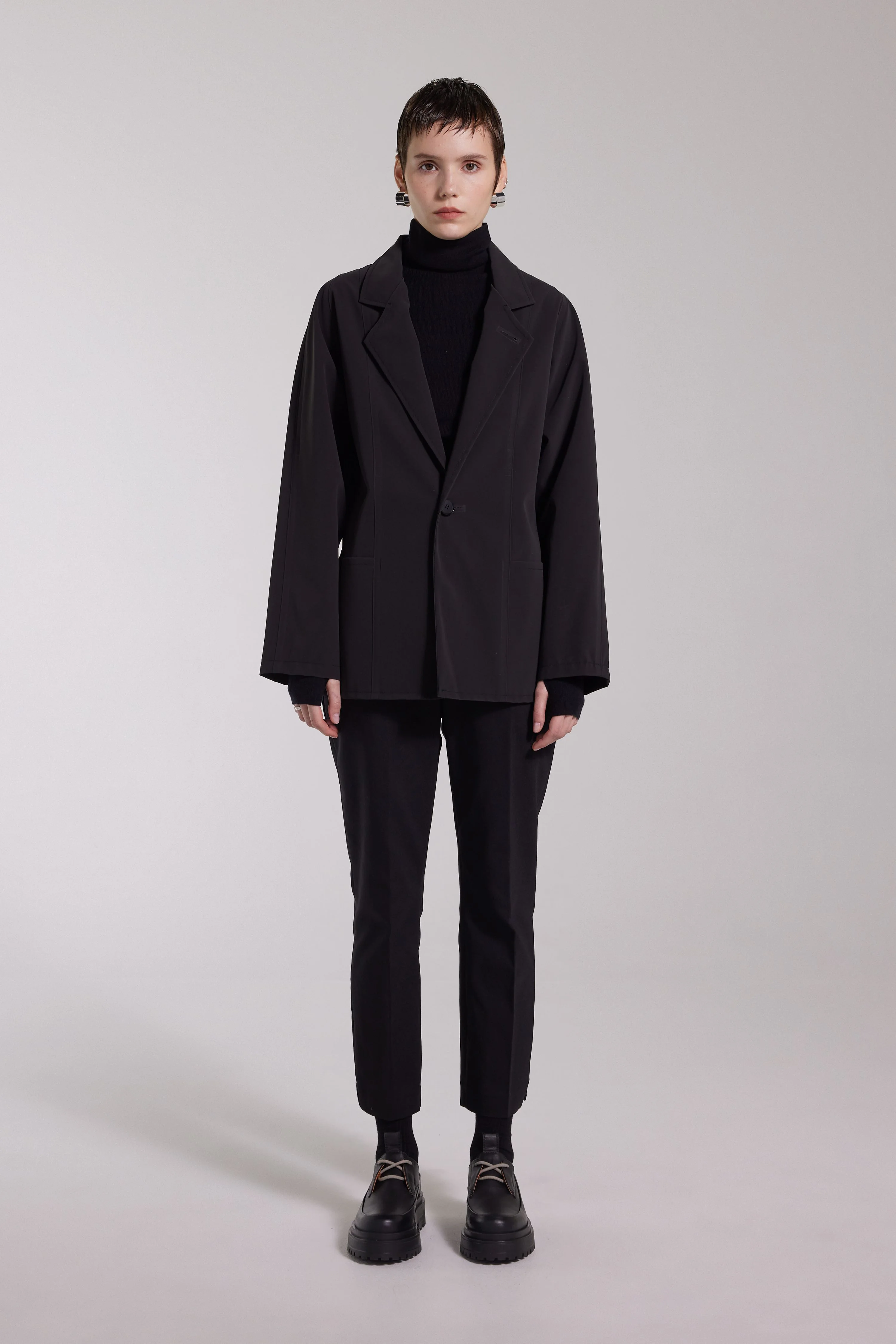 Moberg is a unisex blazer in a light waterproof fabric with a matte finish. Tailored with double-welded seams, there's no risk of getting wet while wearing this relaxed-fit jacket. With a single-button closure and simple patch pockets, this elegant and minimalistic design is a must-have in every wardrobe. The model is 176 cm / 5′ 8″ Wearing → SIZE M GARMENT DETAILS • Lightweight 230-gram waterproof fabric • Matte-textured fabric finish • Relaxed fit • Single-button front closure • Patch pockets • Double-welded seams • +20 000 mm water column pressure • Designed in Stockholm • Made in Europe MATERIAL Coating: 100% PVC rubberized coating Membrane: 100% polyester Read more about our fabrics