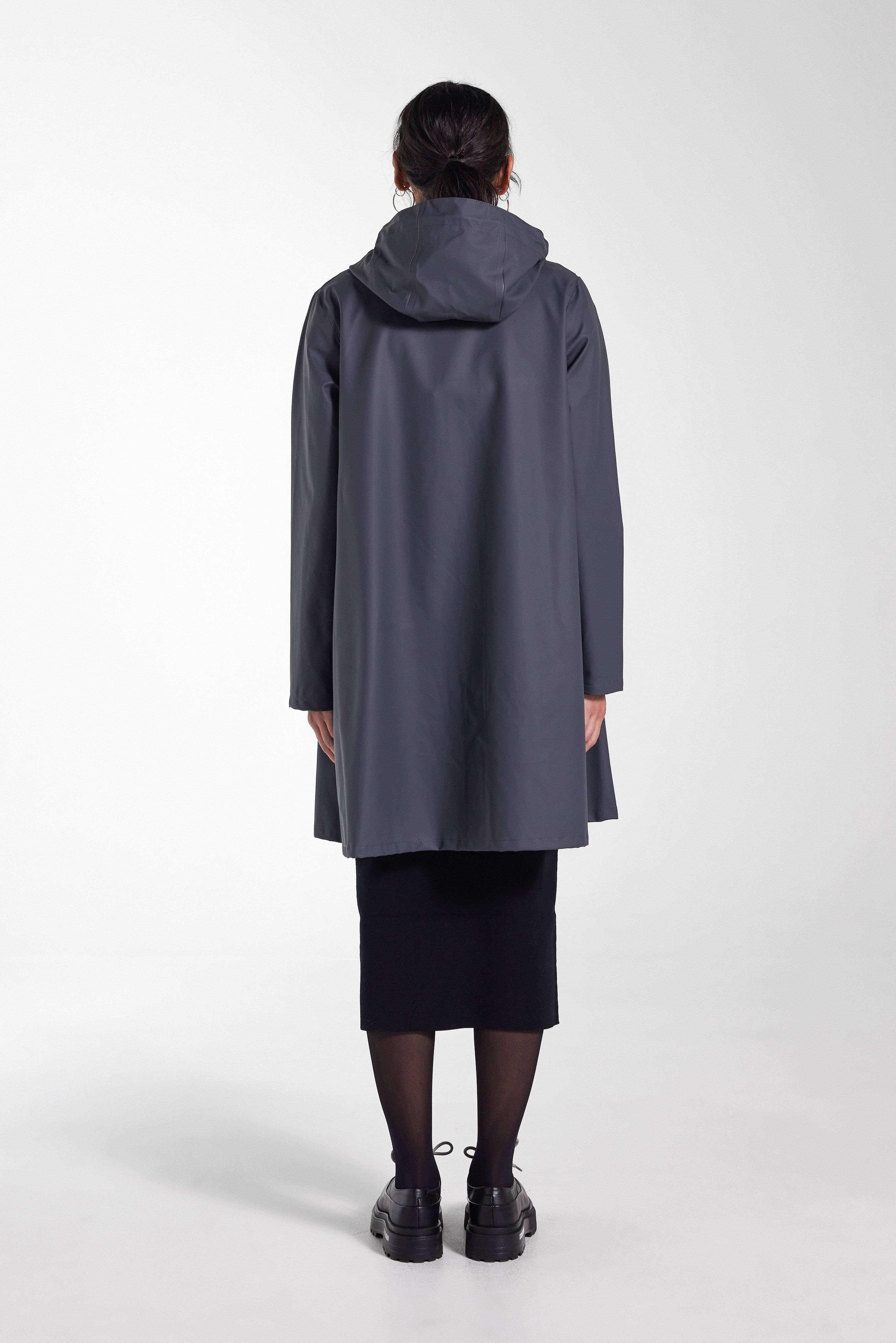 Mosebacke Lightweight is an artisanally made a-line-shaped raincoat for women. The ultra-light waterproof fabric is tailored with double-welded seams, making it impossible for any moisture to seep through. Ease of movement and comfort is achieved with under-arm eyelets and a drawstring hood. The thin and packable fabric makes this garment perfect in unpredictable weather and for travelling. The model is 179 cm / 5′ 10″ Wearing → SIZE S GARMENT DETAILS • Lightweight 230-gram fabric • Packable • Completely waterproof • A-line silhouette • Snap metal button closures • Drawstring hood • Open welt pockets • Double welded seams • Under-arm eyelets for ventilation • +20 000 mm water column pressure • Designed in Stockholm • Made in Europe MATERIAL Coating: 100% PVC rubberized coating Membrane: 100% polyester Read more about our fabrics