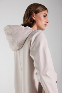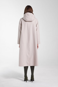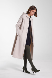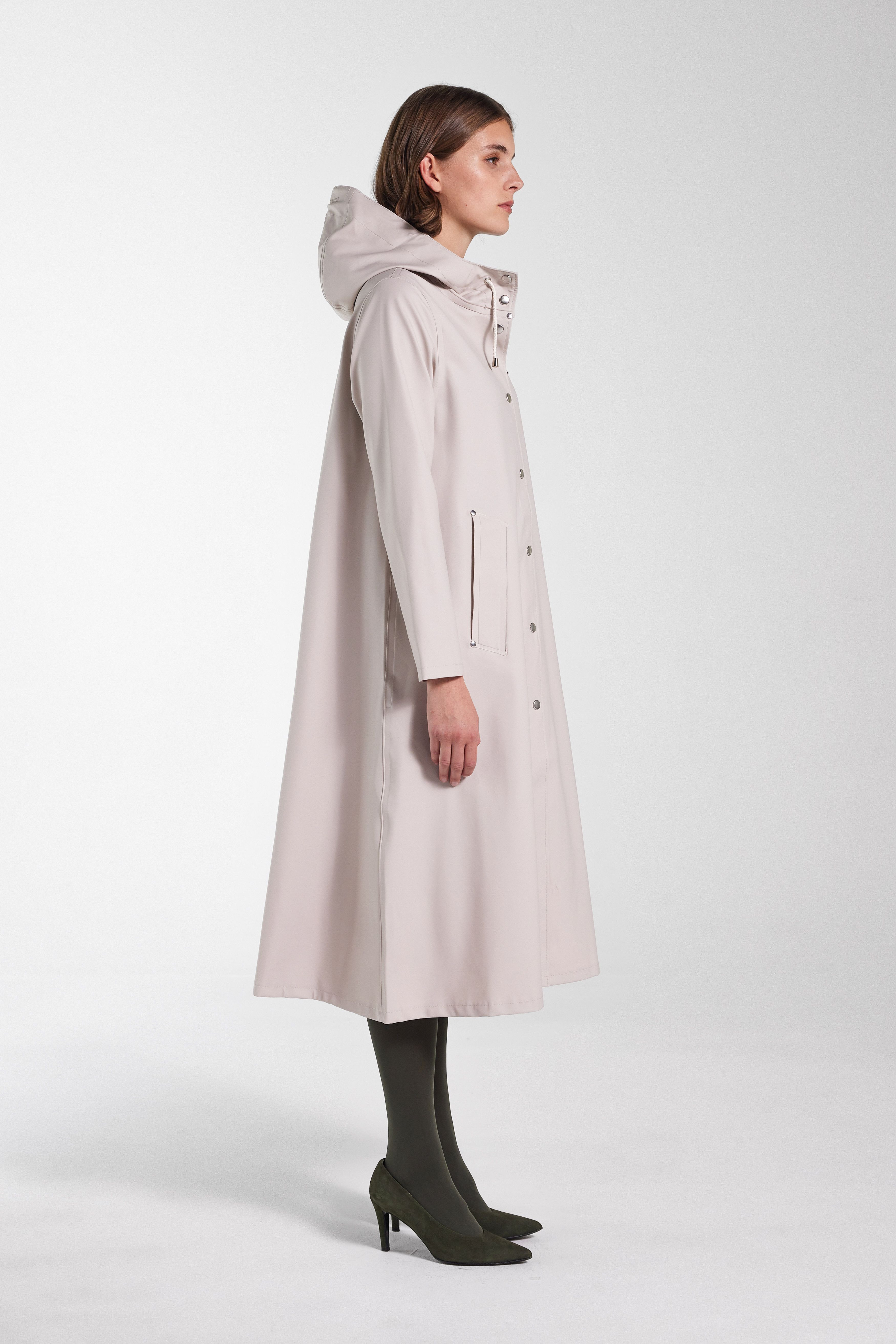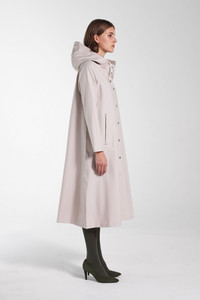 Mosebacke Long is an artisanally made knee-length and a-line-shaped raincoat for women. The sturdy and hard-wearing waterproof fabric is tailored with double-welded seams, making it impossible for any moisture to seep through. Ease of movement and comfort is achieved with under-arm eyelets and a drawstring hood. GARMENT DETAILS • Mid-weight 380-gram fabric • Completely waterproof • A-line silhouette • Knee-length • Snap metal button closures • Drawstring hood • Open welt pockets • Double welded seams • Under-arm eyelets for ventilation • +20 000 mm water column pressure • Designed in Stockholm • Made in Europe MATERIAL Coating: 100% PVC rubberized coating Membrane: 52% cotton, 48% polyester Read more about our fabrics