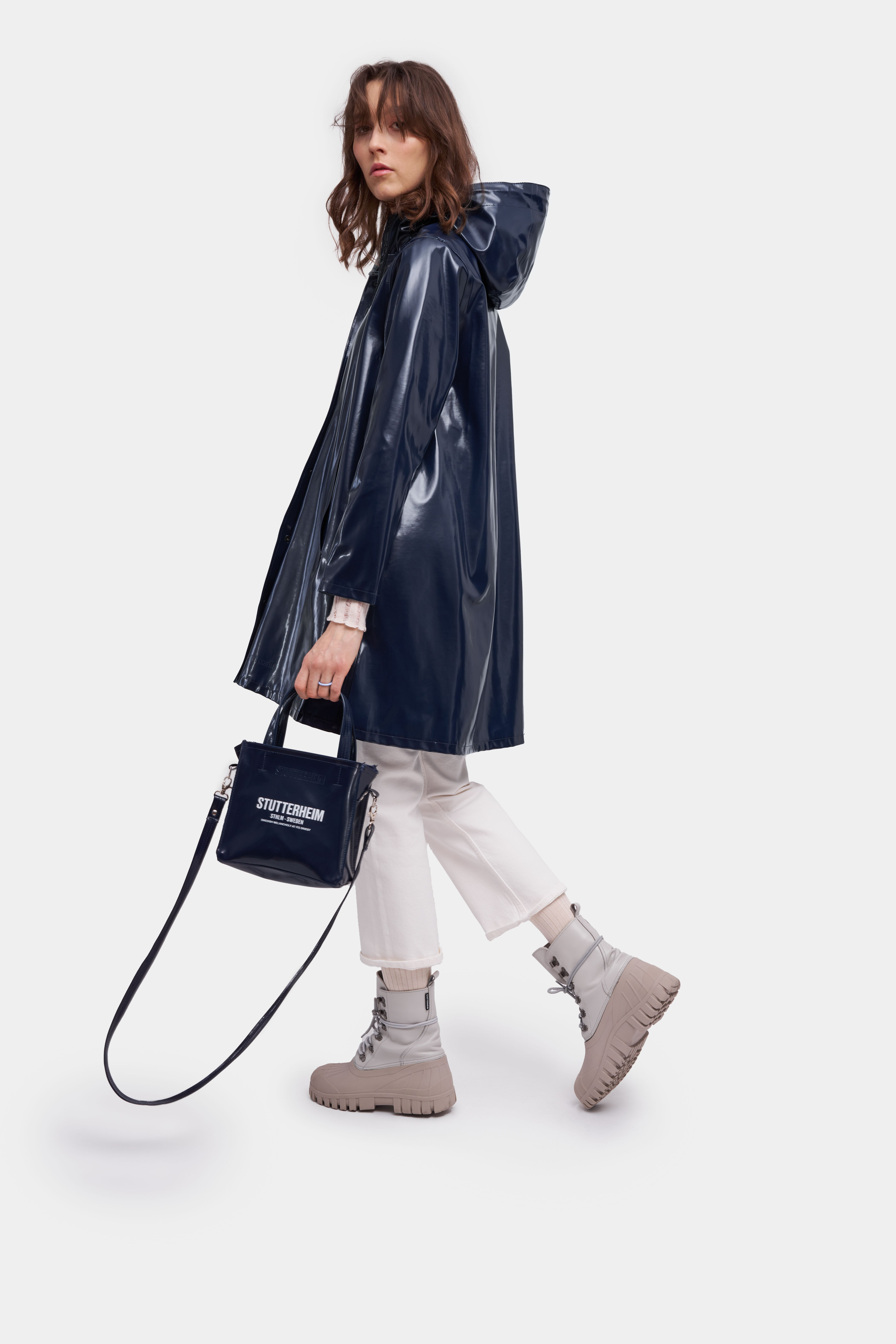 Mosebacke Opal is an artisanally made a-line-shaped raincoat for women. The shiny yet sturdy waterproof fabric is tailored with double-welded seams, making it impossible for any moisture to seep through. Ease of movement and comfort is achieved with under-arm eyelets and a drawstring hood. The model is 177 cm / 5′ 10″ Wearing → SIZE S GARMENT DETAILS • Heavy-weight 530-gram fabric • Shiny high-gloss fabric finish • Completely waterproof • A-line silhouette • Snap metal button closures • Drawstring hood • Open welt pockets • Double welded seams • Under-arm eyelets for ventilation • +20 000 mm water column pressure • Designed in Stockholm • Made in Europe MATERIAL Coating: 100% PVC rubberized coating Membrane: 52% cotton, 48% polyester Read more about our fabrics