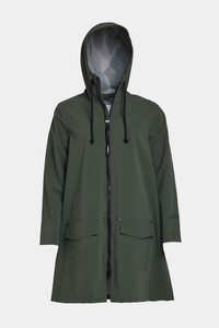 Meet Mosebacke 2.0. Based on our classic style Mosebacke, this version of the A-lined raincoat for women boasts of all the features that make the original an essential wardrobe staple, while incorporating new and improved features based on customer feedback. Expertly made in light and airy waterproof fabric and tailored with triple-welded seams to keep any moisture from seeping through, the new features include patch pockets with flaps to keep your valuables dry and safe as well as a capped hood for clear vision and perfect hair, even in less than perfect weather. GARMENT DETAILS • Lightweight 280-gram fabric • Packable • Completely waterproof • A-line silhouette • Heavy acrylic zipper • Capped drawstring hood • Chunky cotton drawstrings • Patch pockets with flaps • Triple-welded seams • Under-arm eyelets for ventilation • +20 000 mm water column pressure • Designed in Stockholm • Made in Europe MATERIAL Coating: 100% PVC rubberized coating Membrane: 100% polyester Read more about our fabrics