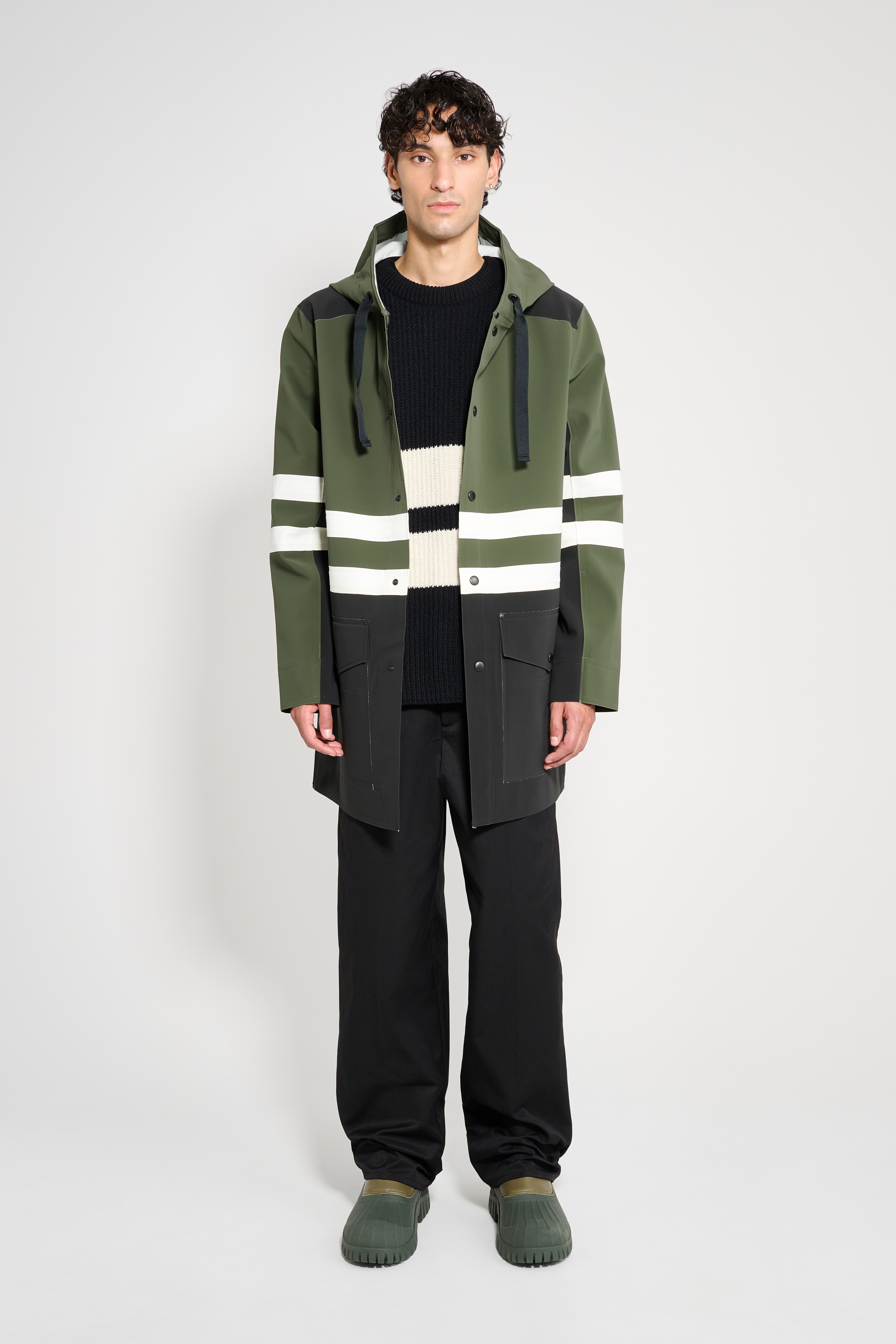 Nockeby is a straight-fit raincoat for men in sturdy, matte-textured waterproof fabrics. Expertly made, it’s tailored with triple-welded seams for complete protection against the rain. The drawstring hood and under-arm eyelets add ease of movement and comfort, while the two-tone design and colour-block stripes make this a true statement style, defying bad weather in the name of fashion. The model is 183 cm / 6'0 Wearing → SIZE M GARMENT DETAILS - Heavyweight 530-gram fabric - Matte-textured finish - Completely waterproof - Regular fit - Snap metal button front closure - Drawstring hood - Webbed laces - Patch pockets with flaps - Triple-welded seams - Under-arm eyelets for ventilation - +20 000 mm water column pressure - Designed in Stockholm - Made in Europe MATERIAL Coating: 100% PVC rubberized coating Membrane: 52% Cotton, 48% polyester Read more about our fabrics