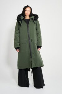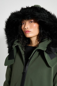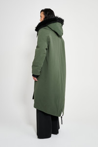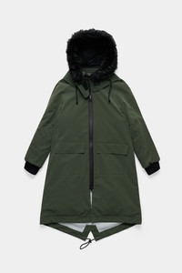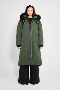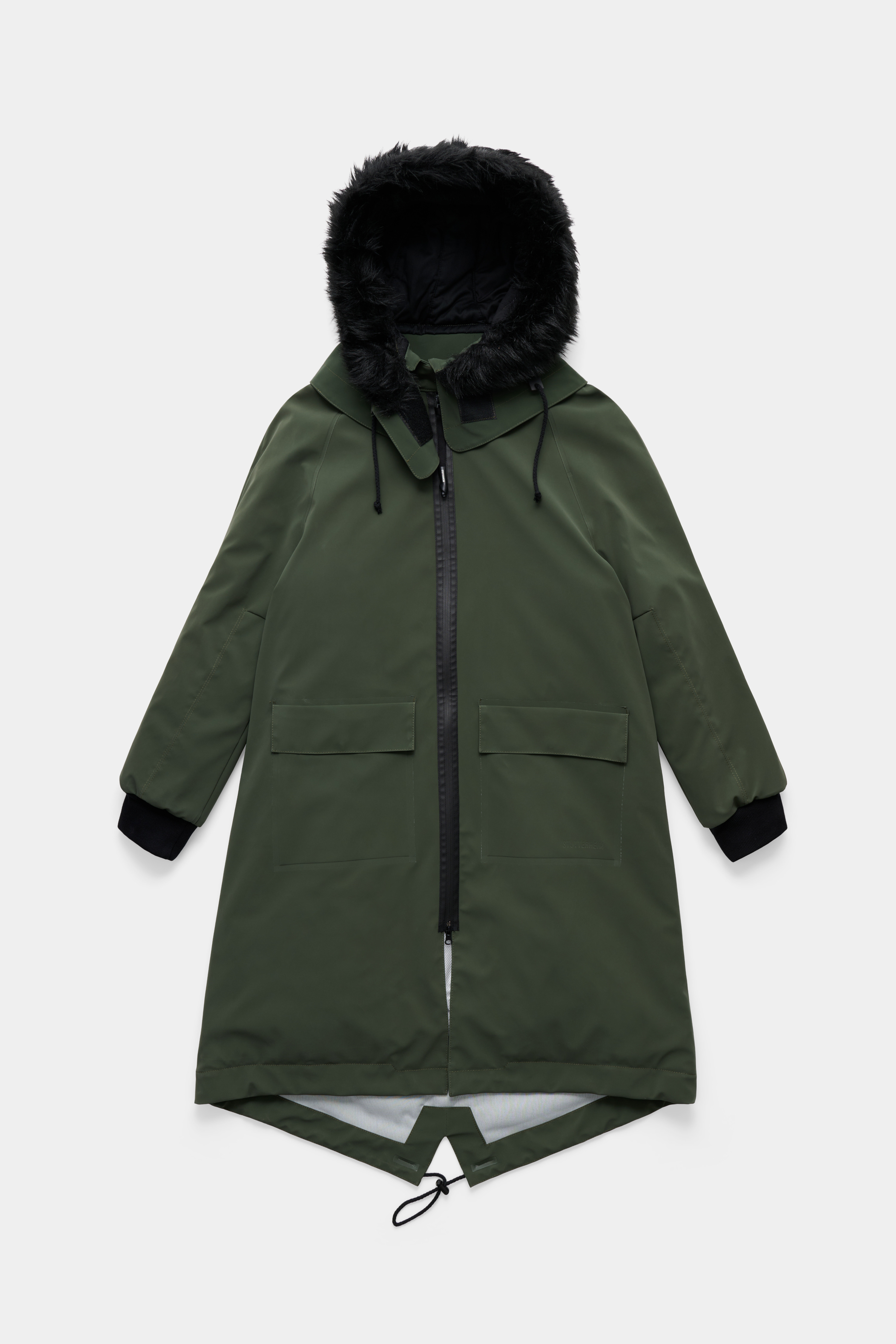 Pajala is an a-line-shaped fishtail parka for women in sturdy and hard-wearing waterproof fabric with a matte finish. It’s insulated with padding for warmth during the winter season. Expertly made, this warm rain jacket is tailored with double-welded seams for complete protection against wet and cold weather. The detachable and adjustable collar and hood with a faux fur brim add extra comfort and warmth to the style. GARMENT DETAILS • Midweight 280-gram shell fabric • Matte-textured finish • Completely waterproof • 150-gram technical insulator filling • Polyester lining • A-line silhouette • Knee-length • Adjustable drawstring fishtail back detail • Aqua guard zipper • Detachable hood with faux fur brim • Adjustable toggles and overlapping velcro front closure on hood • Knitted wristlets • Fleece-lined side pockets • Fleece-lined inner pocket • Double-welded seams • +20 000 mm water column pressure • Designed in Stockholm • Made in Europe MATERIAL Coating: 100% PVC rubberized coating Membrane: 100% polyester Lining: 100% polyester with polly filling Faux fur: 100% polyester Read more about our fabrics