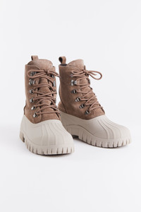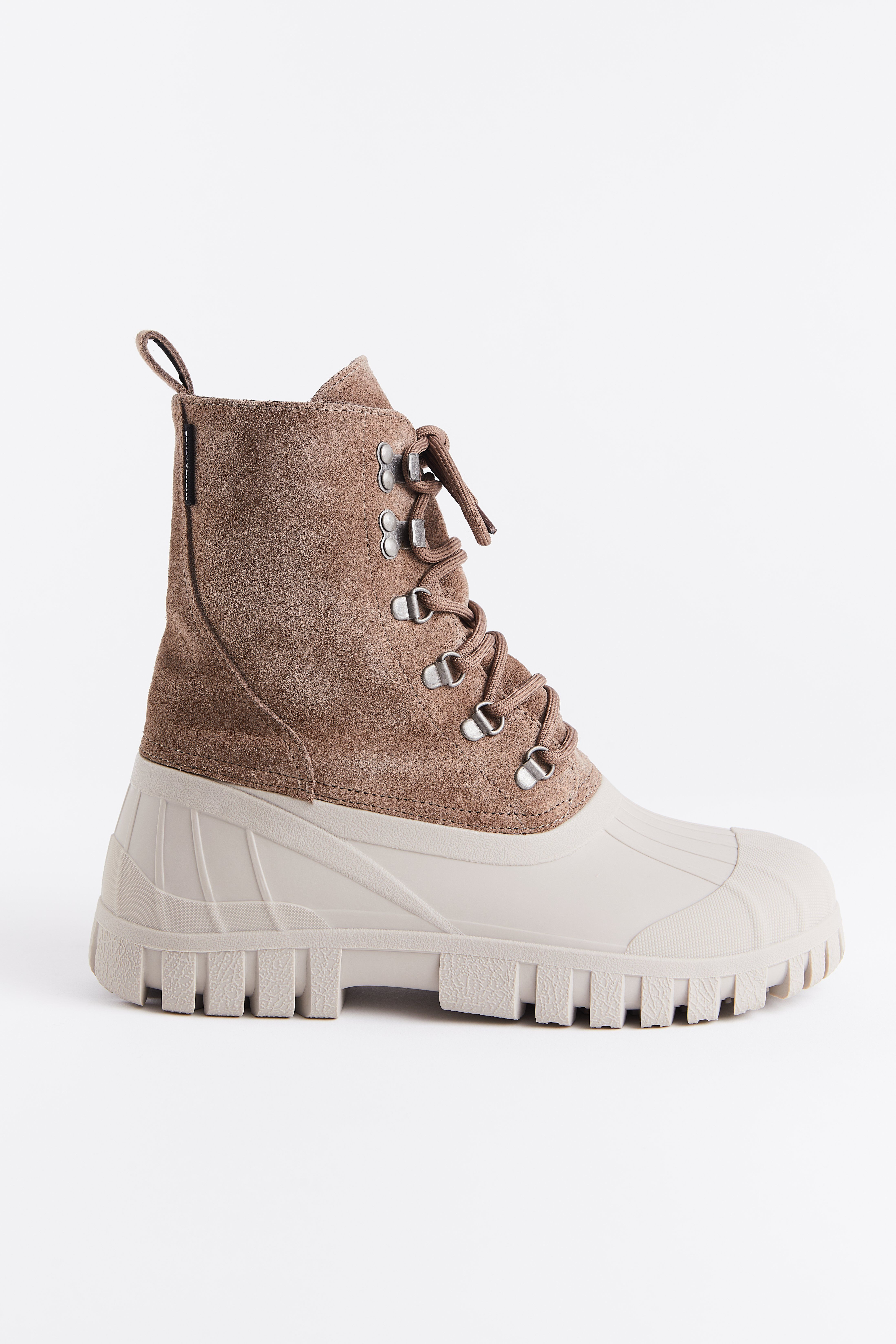 Patrol Boots are modern duck boots made for urban usage. Stylish as well as practical — a perfect trans-seasonal shoe suitable in spring and autumn, as well as winter when paired with warm socks or an added thermo sole. Constructed with a suede upper which has been treated to be water-repellent and a galosh-style duck sole, you can rest assured that your feet will be kept dry. The rubber lug sole ensures a firm grip on slippery ground and the padded ankle-length shaft adds warmth and comfort on days you need it the most. GARMENT DETAILS • Waterproof rubber lug sole • Water-repellent treated suede upper • Galosh-style duck sole • Rounded shell toe • Ankle-length • Front lace-up fastening • Small logo patch on shaft • Padded ankle • Pull-tab at back • Unisex style • Designed in Stockholm • Made in Europe MATERIAL Upper: Vegetable-tanned Italian suede Outsole: Rubber Laces and details: Polyester and metal Read more about our fabrics