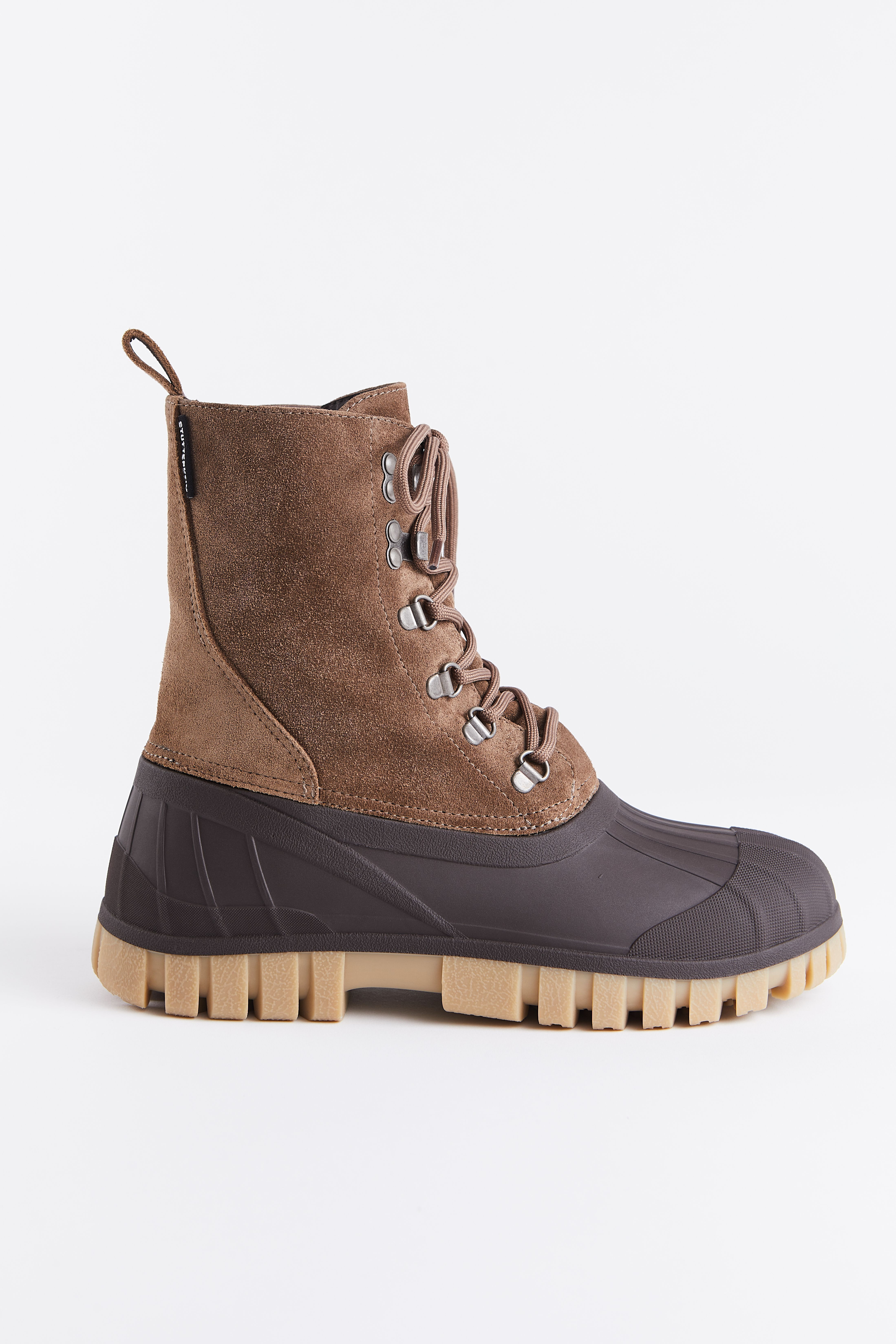 Patrol Boots are modern duck boots made for urban usage. Stylish as well as practical — a perfect trans-seasonal shoe suitable in spring and autumn, as well as winter when paired with warm socks or an added thermo sole. Constructed with a suede upper which has been treated to be water-repellent and a galosh-style duck sole, you can rest assured that your feet will be kept dry. The rubber lug sole ensures a firm grip on slippery ground and the padded ankle-length shaft adds warmth and comfort on days you need it the most. GARMENT DETAILS • Waterproof rubber lug sole • Water-repellent treated suede upper • Galosh-style duck sole • Rounded shell toe • Ankle-length • Front lace-up fastening • Small logo patch on shaft • Padded ankle • Pull-tab at back • Unisex style • Designed in Stockholm • Made in Europe MATERIAL Upper: Vegetable-tanned Italian suede Outsole: Rubber Laces and details: Polyester and metal Read more about our fabrics
