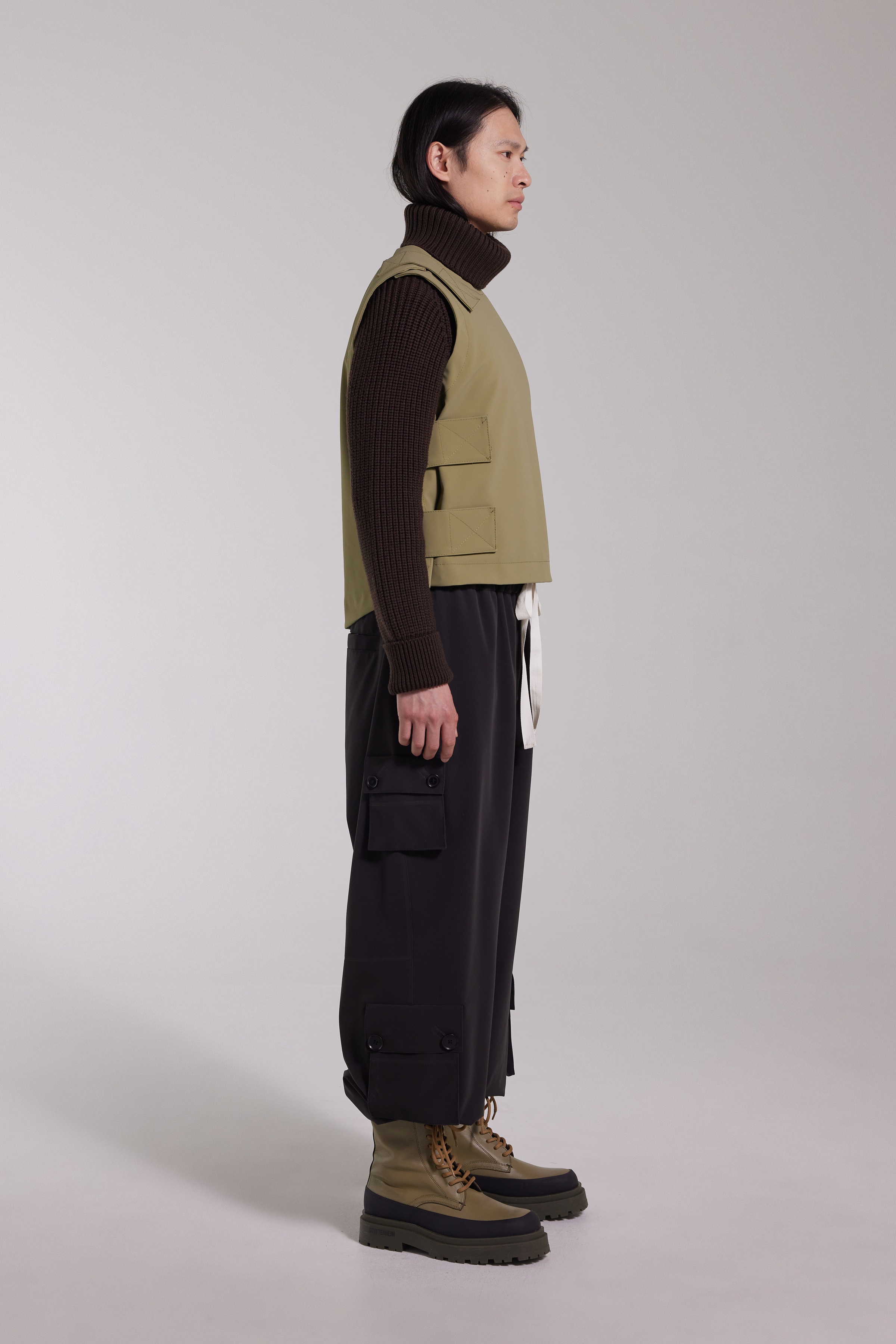Peace Vest is a military-style vest for men. Made in sturdy and hard-wearing waterproof fabric with a thin layer of padding, this garment is crafted to withstand the elements. Two velcro straps at the side and one at the shoulder make it easy to transition in and out of and it's a perfect piece for layering. The model is 184 cm / 6′ 1″ Wearing → SIZE M GARMENT DETAILS • Heavyweight 530-gram waterproof fabric • Matte-textured finish • Velcro side closures • Velcro shoulder closure • Light padding • Contrast colour logo print at bottom of back • +20 000 mm water column pressure • Designed in Stockholm • Made in Europe MATERIAL Coating: 100% PVC rubberized coating Membrane: 100% polyester Lining: 100% polyester with polly filling Read more about our fabrics