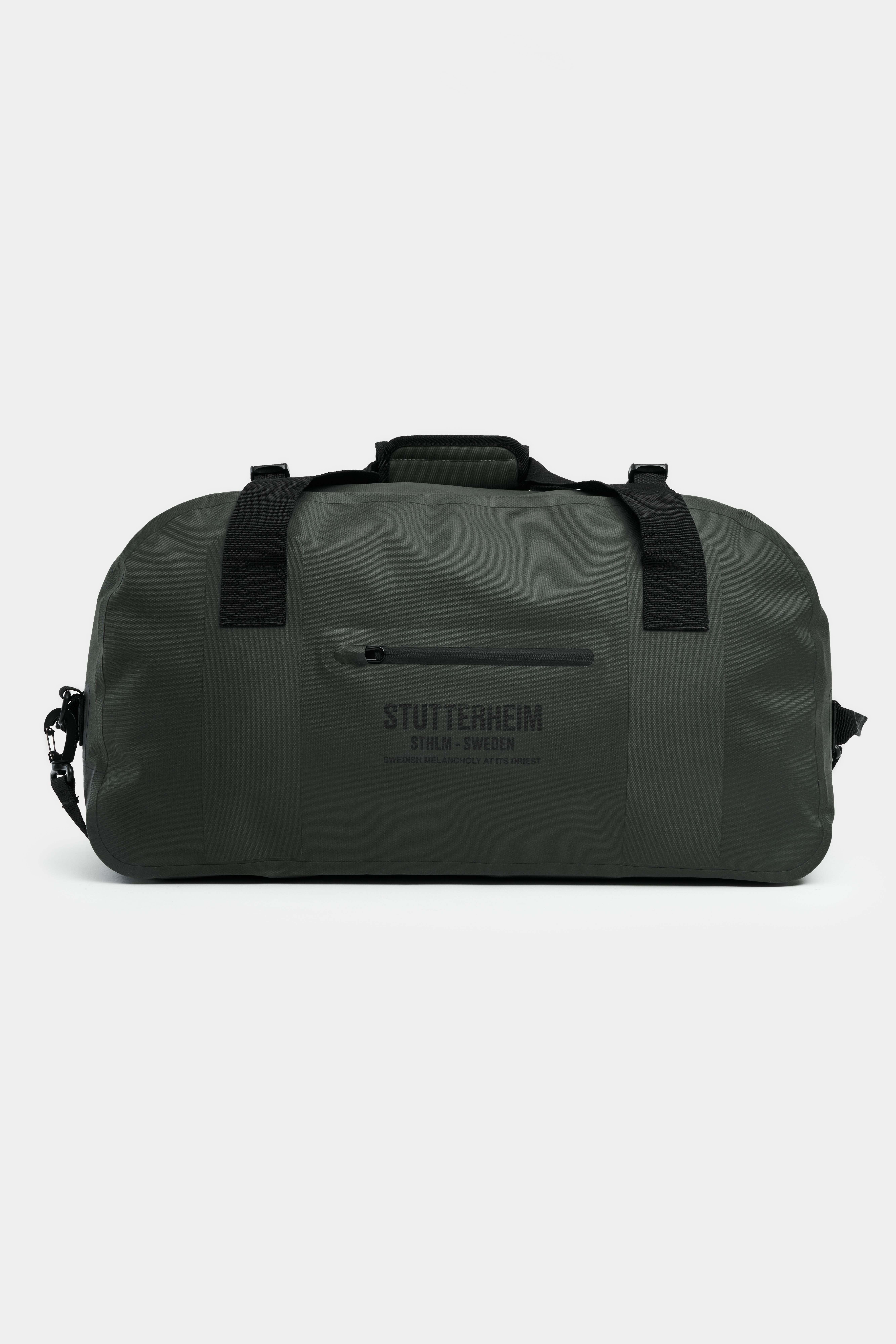 Rain Duffel is a waterproof duffel bag in the classic tubular shape with a spacious main compartment and a long and wide top feeder for easy access. An adjustable and padded crossbody/shoulder strap, as well as carry straps with comfortable handle wraps, make carrying heavy packing more manageable with a variety of grips. Also features a front pocket for smaller items and water-resistant zippers. GARMENT DETAILS • Completely waterproof • Classic tubular shape • Single main compartment • Large top zip opening • Front zip pocket • Top handles with comfortable handle wrap • Adjustable padded crossbody/shoulder strap • 8000 mm water column pressure • Designed in Stockholm • Height: 57 cm / 22.4″ • Width: 32 cm / 12.6″ • Depth: 24 cm / 9.4″ • Capacity: 50 litres / 13.2 gallons MATERIAL 87% PVC and 13% polyester Read more about our fabrics